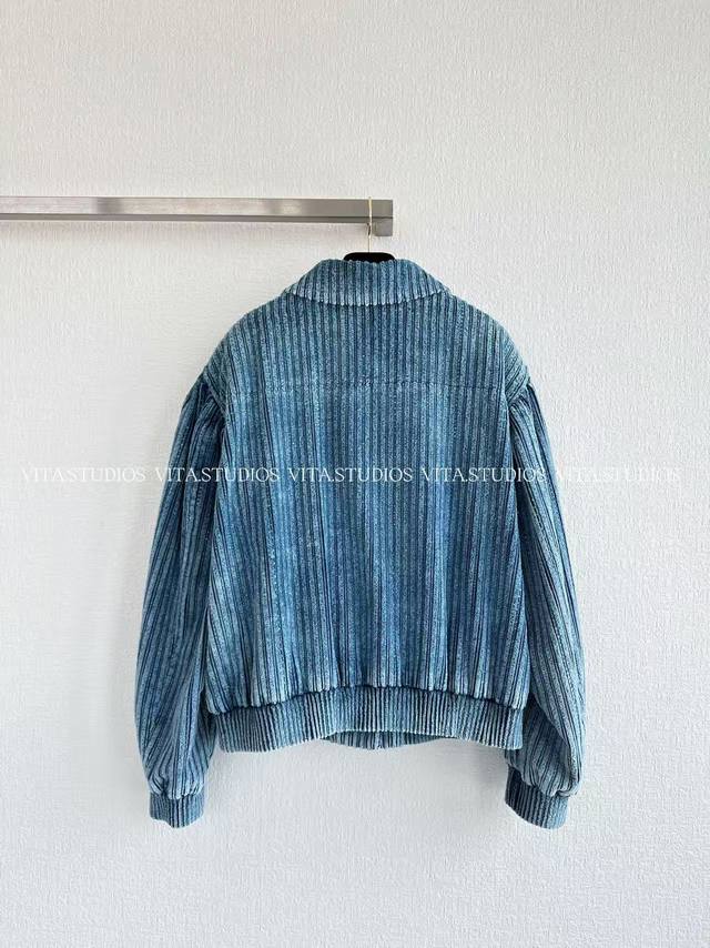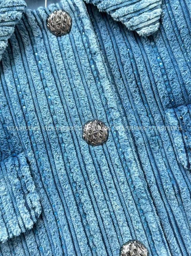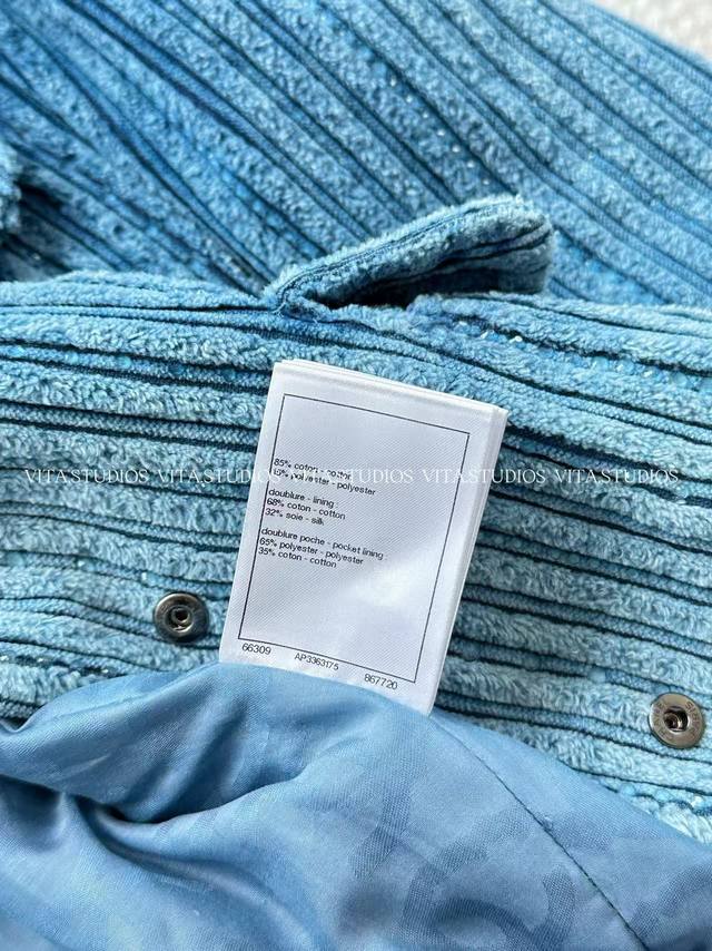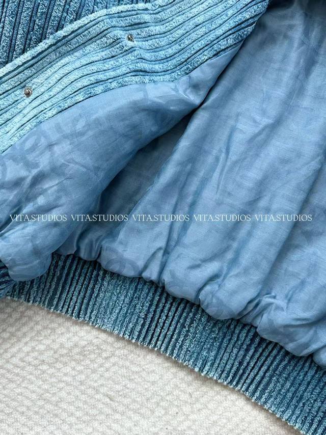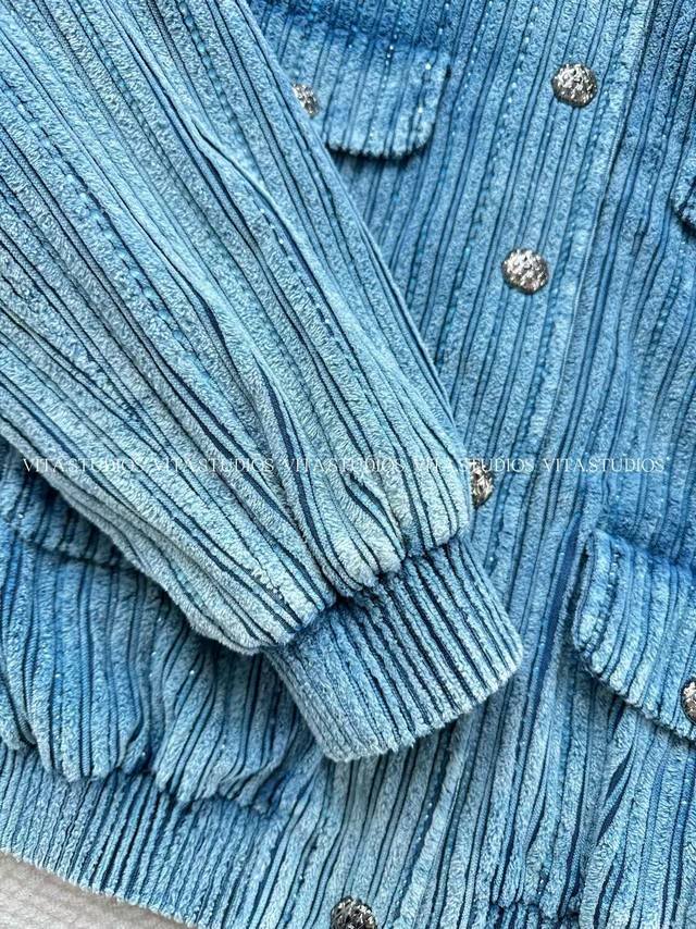 New Pre-sale DDD Full Rhinestone Corduroy Jacket Ddd Made of 85% cotton and 15% polyester blend fabric Ddd Cotton provides a warm and skin-friendly touch, while polyester enhances the fabric's crispness and wrinkle resistance Ddd Retains the retro texture of corduroy, avoiding the problems of pure cotton color fading and becoming soft and limp Ddd Custom-made fabric undergoes a general wash pre-treatment before cutting, making the corduroy texture softer and fluffier Ddd After the finished product is washed and shaped, it is disassembled into pieces and ironed flat, with rhinestones arranged according to the vertical stripe pattern of the corduroy Ddd The rhinestones face the same direction as the texture, presenting a delicate shimmering effect under light Ddd The rhinestone process has high durability and does not damage the soft texture of the fabric Ddd The placket uses metal snap buttons, and the inner lining is filled with thin cotton to enhance warmth Ddd High-elasticity elastic is sewn on the hem and cuffs for a flexible fit Ddd Stitching is added inside the vertical stripe grooves of the corduroy to reinforce the stripe structure Ddd Front opening pocket flap decoration. The front panel features an inlaid opening. The flap is hand-stitched with mesh for a washed, naturally distressed effect. Color: Blue. Sizes: S, M, L, C, Wt.