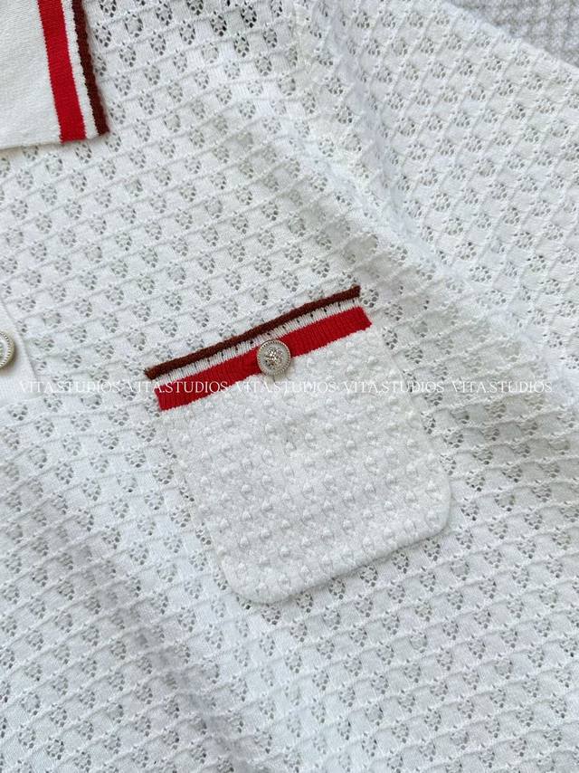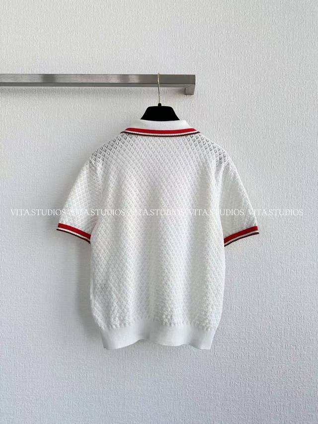 New Product Release DDD Collared Knit Short-Sleeve T-Shirt Ddd Made of a blend of 95% cotton and 5% cashmere Ddd Cotton ensures the fabric is skin-friendly, breathable, and highly absorbent, suitable for spring and summer wear Ddd Cashmere gives the fabric a delicate and smooth touch Ddd Reduces the stiffness of pure cotton and improves wearing comfort Ddd The entire garment uses a diamond-pattern openwork knitting technique Ddd The fine diamond-pattern openwork is woven on a flat knitting machine Ddd Maintains a crisp shape while improving breathability Ddd The collar and cuffs feature a contrasting stripe design Ddd The edges of the front patch pockets also feature the same contrasting stripe design Ddd Echoing details with the collar and cuffs DDD Colors: Black, White Ddd Sizes: S, M, L Ddd M*Z x DDD