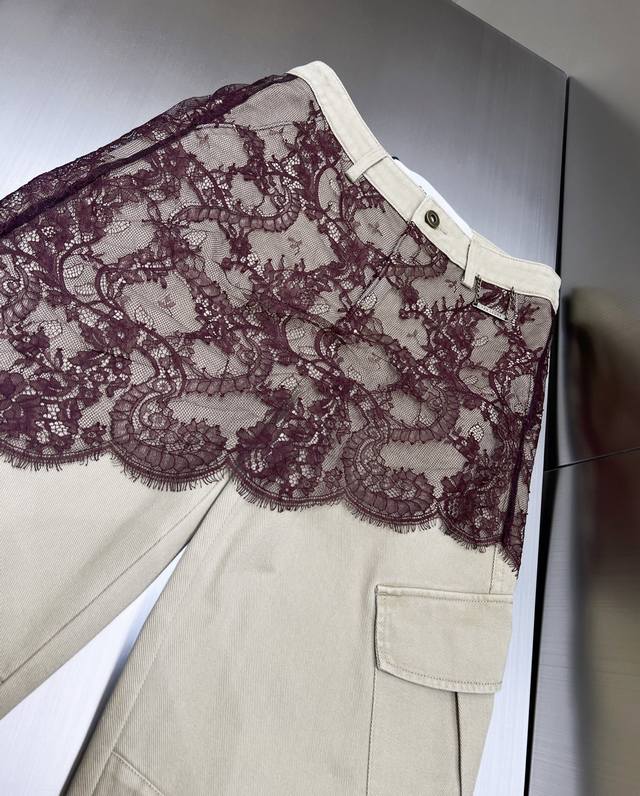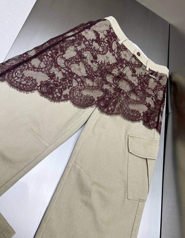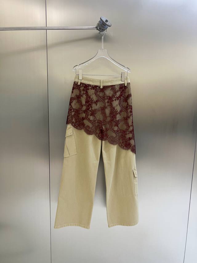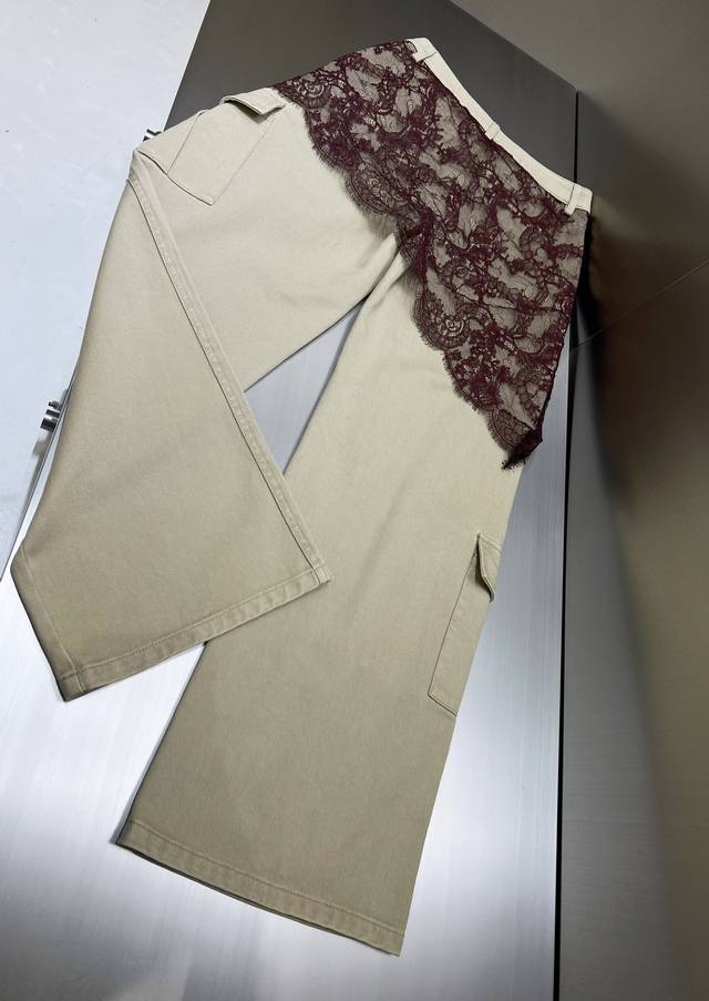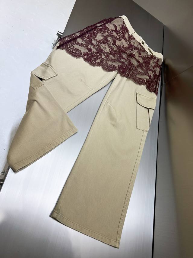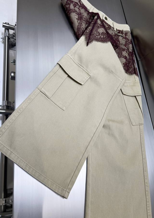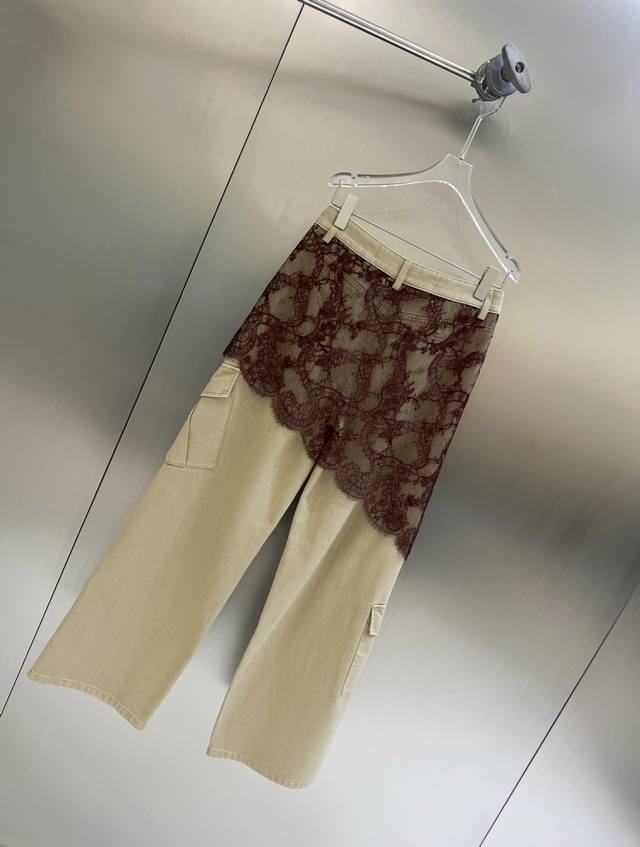 2025 autumn and winter new asymmetrical lace patchwork work jeans. Retro barn style with stunning color matching. Asymmetrical lace patchwork technology shows the plasticity of the overalls. The upper body effect is amazing. Boyfriend style loose pants. Cotton denim fabric has a superb texture. Must-get details online