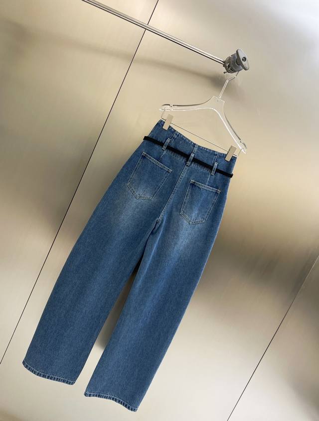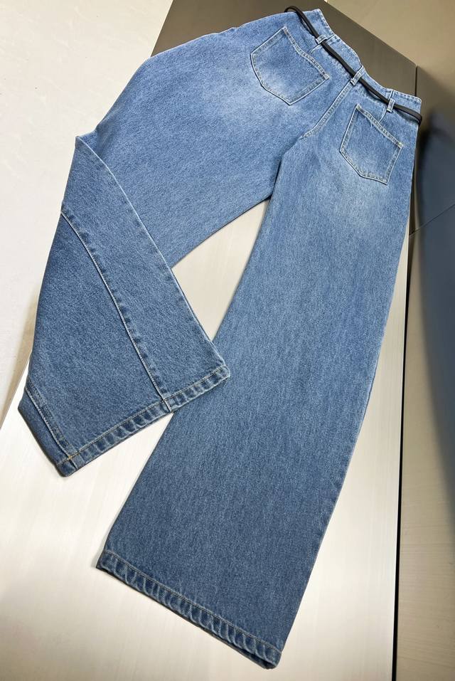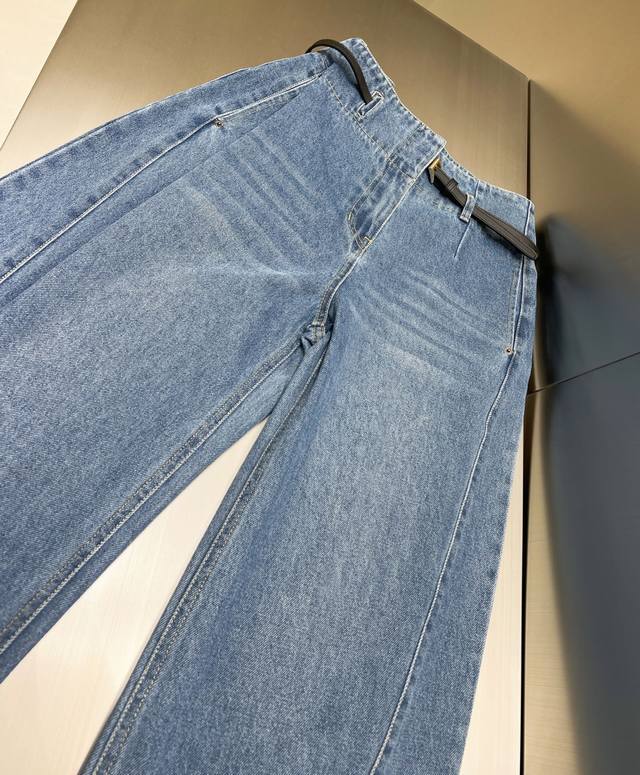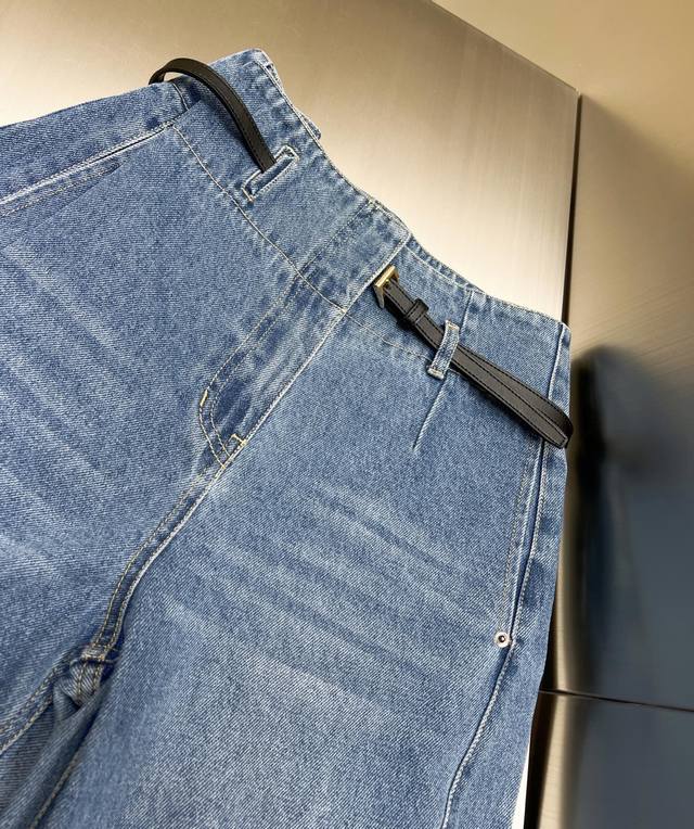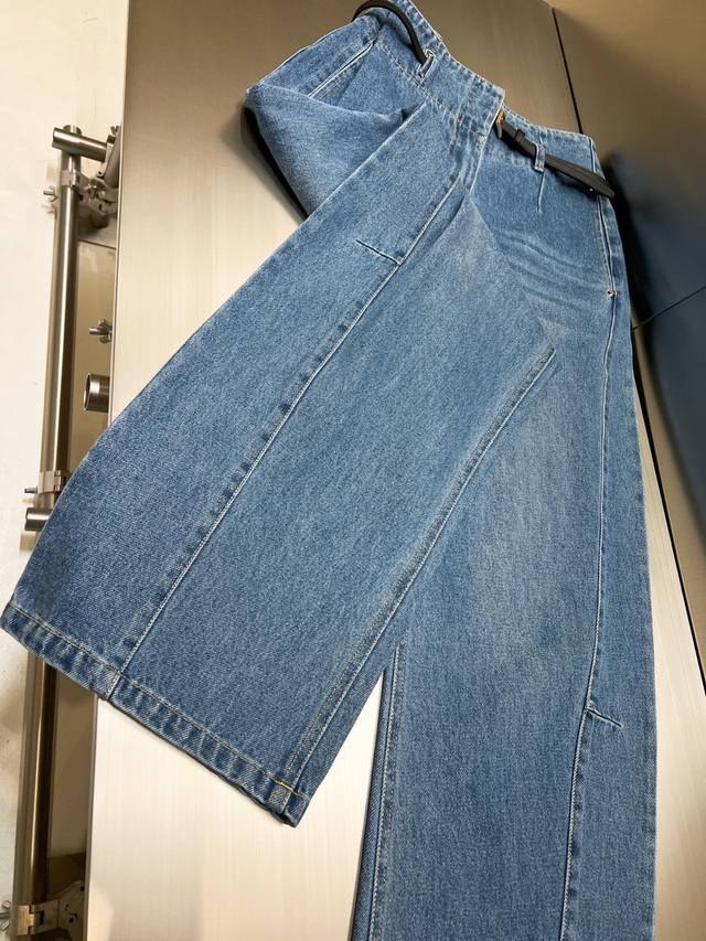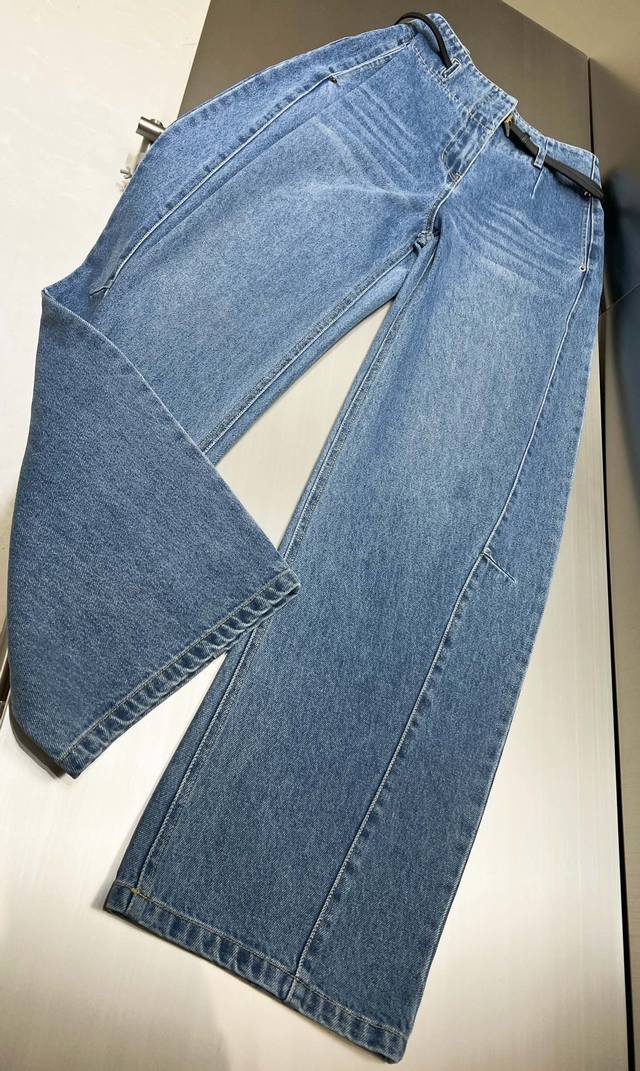 2025 Fall/Winter new high-waisted, pleated, wide-leg jeans with a belt. A pair you'll love at first sight, unlike the usual styling. Perfect fit. High-waisted, one-side pleating at the waist. The belt is a stylish and sophisticated accessory. Custom-made denim fabric is strong and wide, with a great texture for all seasons. The curved, loose fit creates a long, sculpted look. The color is washed perfectly, and it's impossible not to love the details.