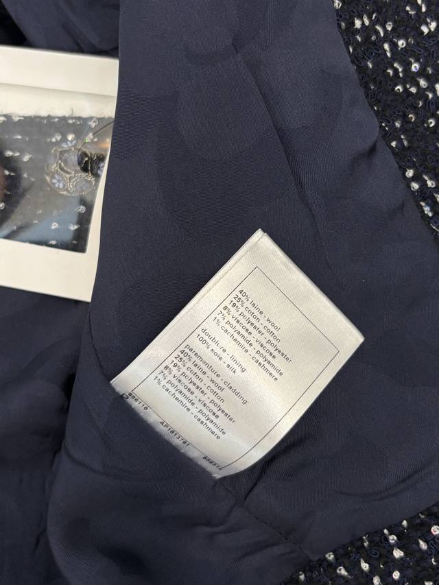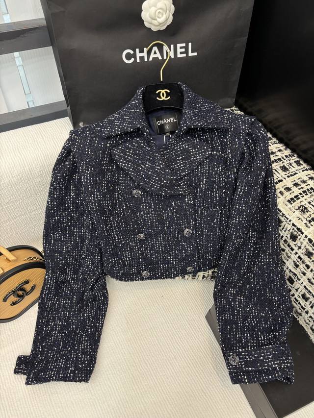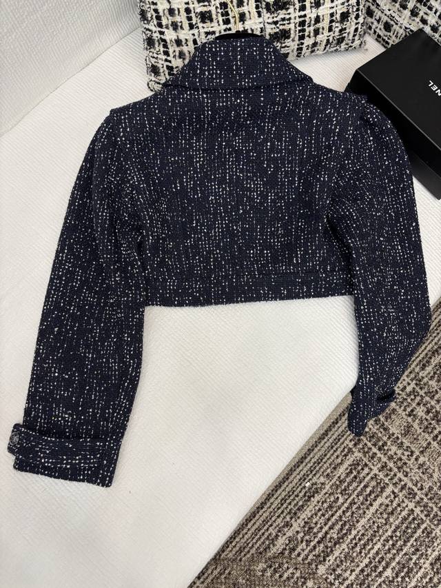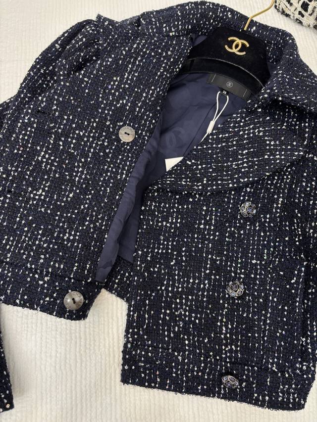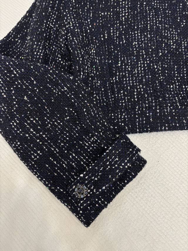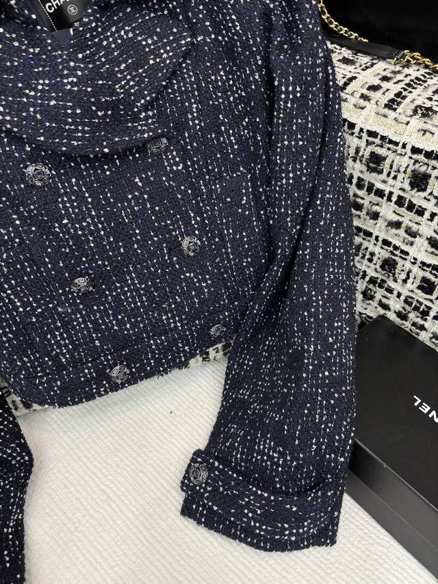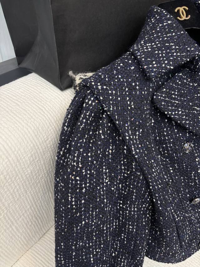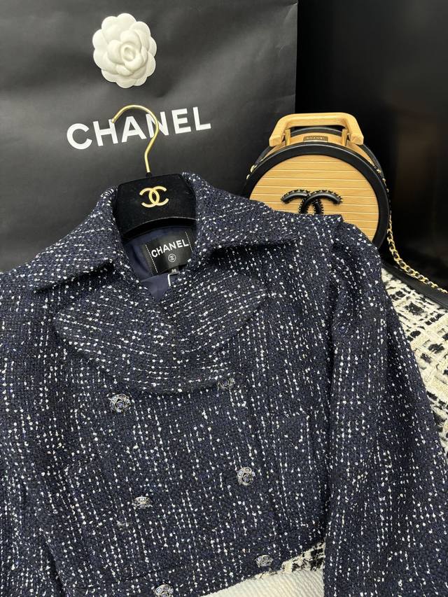 New spot Chanel classic tweed with navy blue background and silver glitter, with built-in galaxy filter~ Double-breasted + scarf collar design welds French elegance on the body Sml