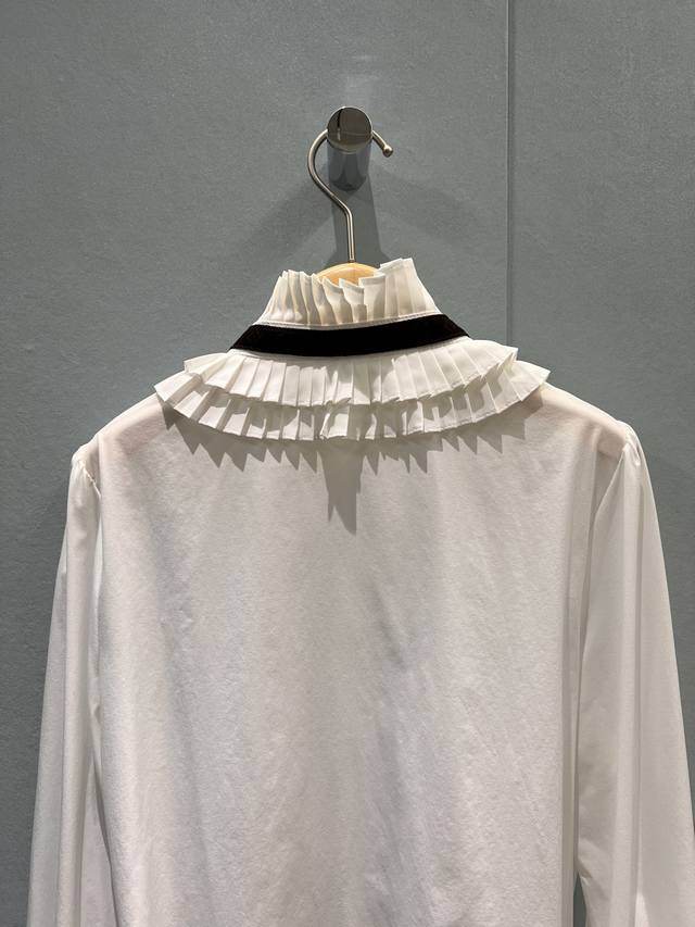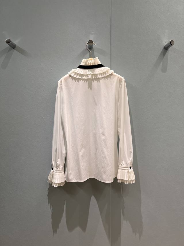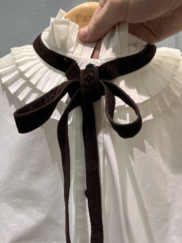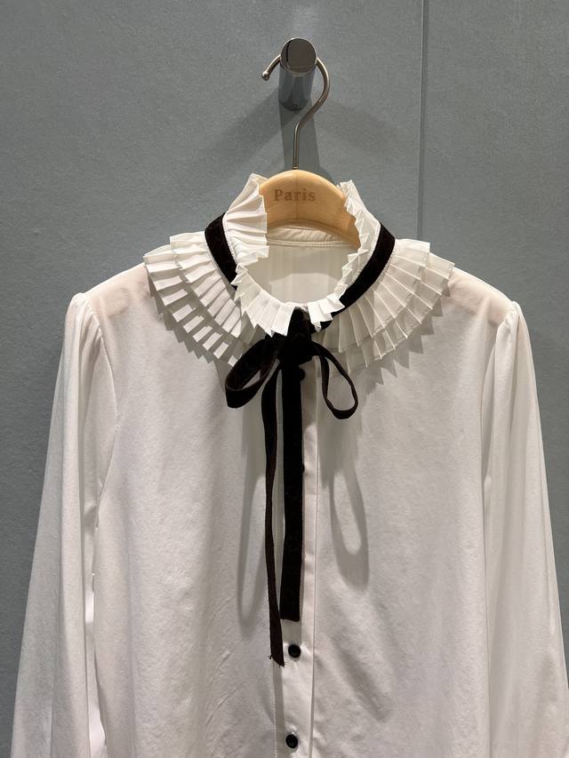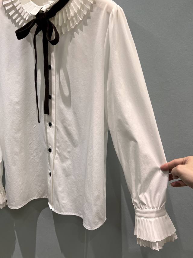 New style pleated stand-up collar double lace shirt with bow decoration pleated lotus leaf lace cuffs velvet strap logo embossed sweet age-reducing temperament all-match Sml