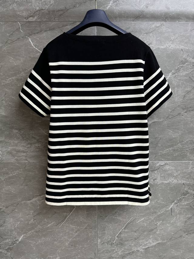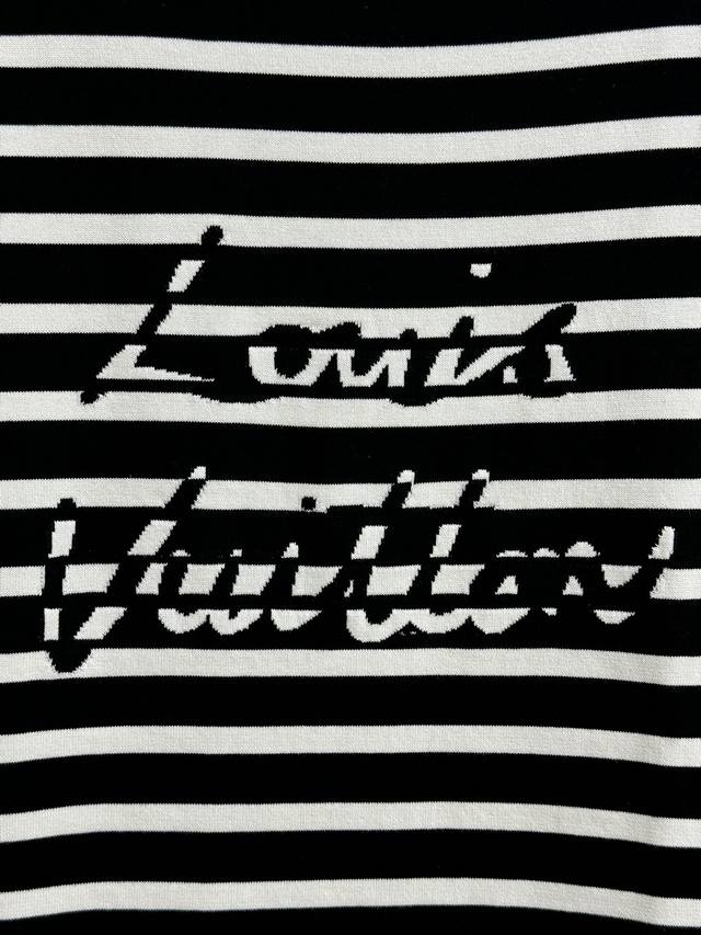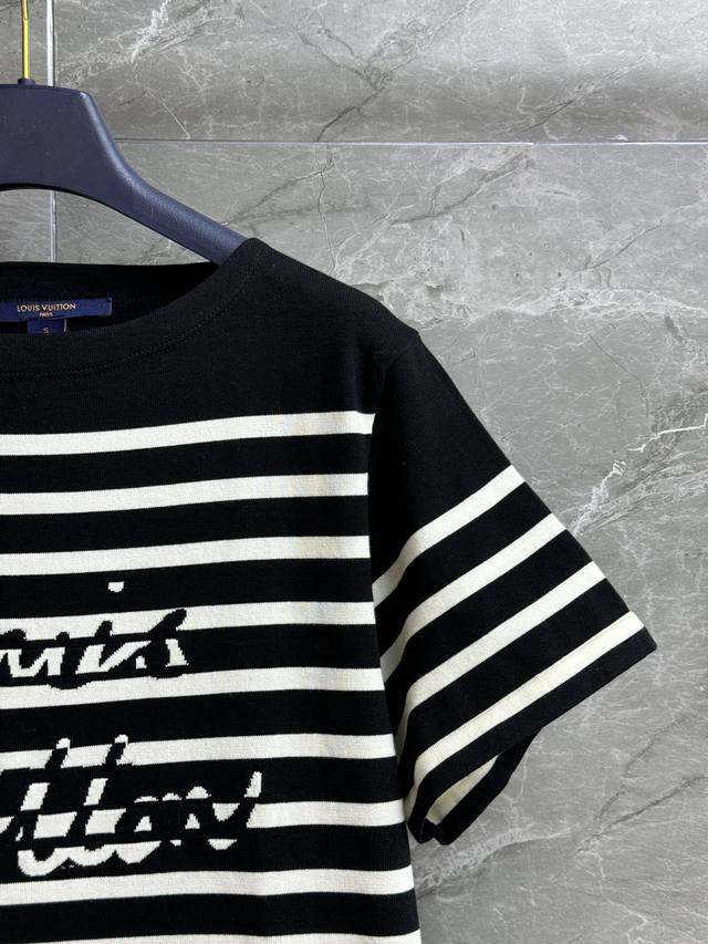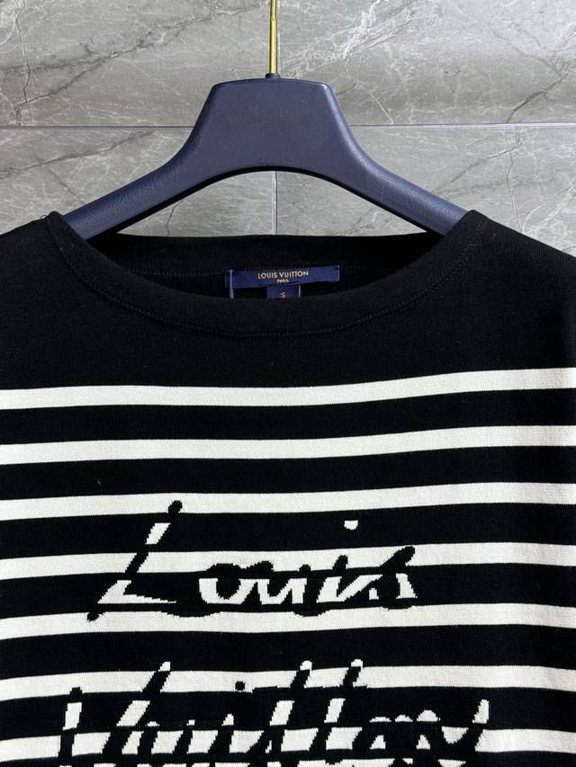 L's striped knit top, 2025 nautical collection, boat neckline design, reverse stripes, logo, and letter jacquard pattern. Simple and high-quality cotton blend knit fabric, comfortable and breathable straight-cut style, slimming and versatile. Full label available in sizes S, M, L, and