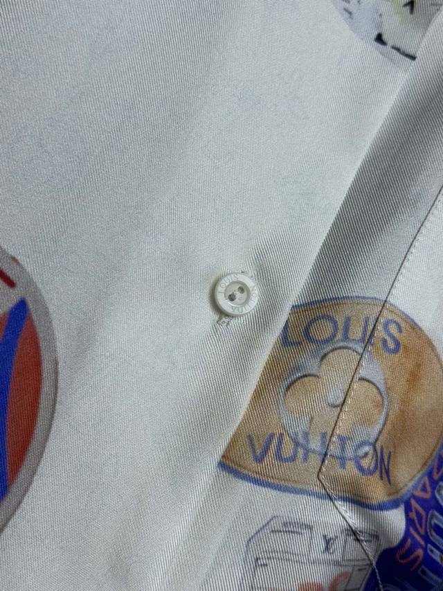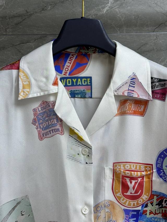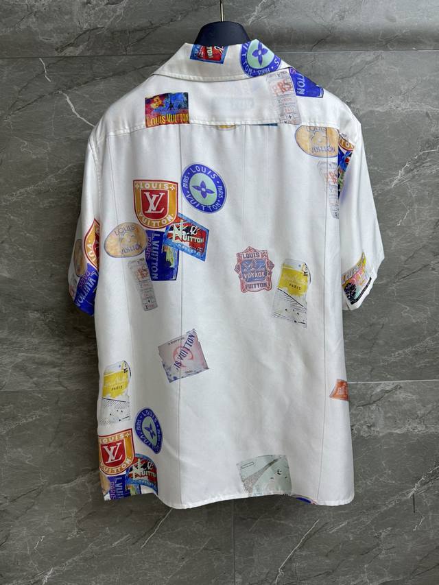 L printed short-sleeved shirt 2025 spring and summer series. Lapel short-sleeved design. Classic dark pattern with old flower pattern and colorful badge print. Casual and fashionable custom silk fabric. Comfortable and skin-friendly. Loose version. Suitable for everyone. Brand name. Full size Sml