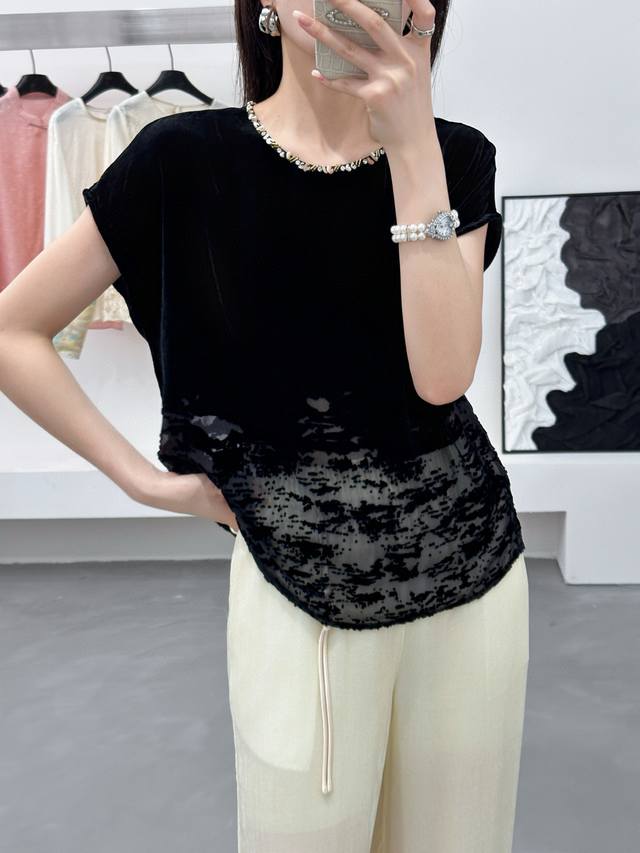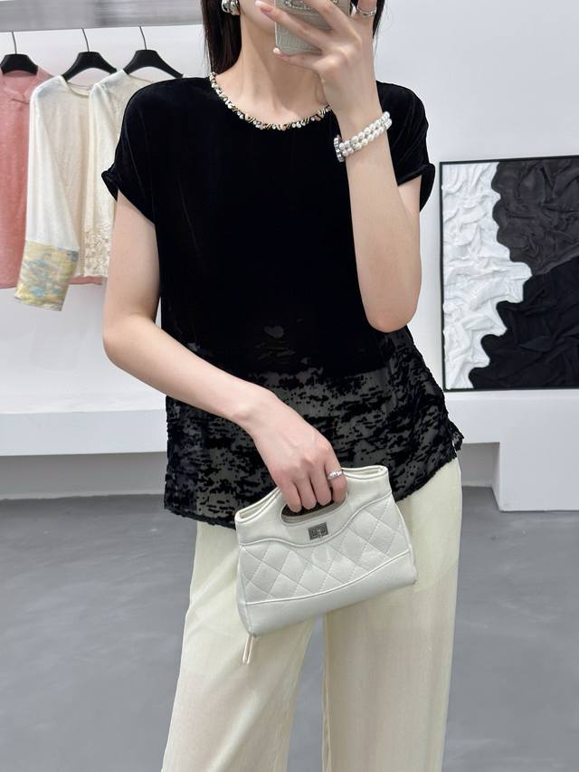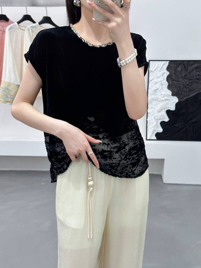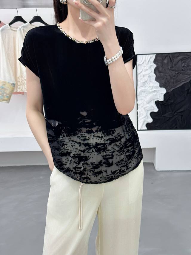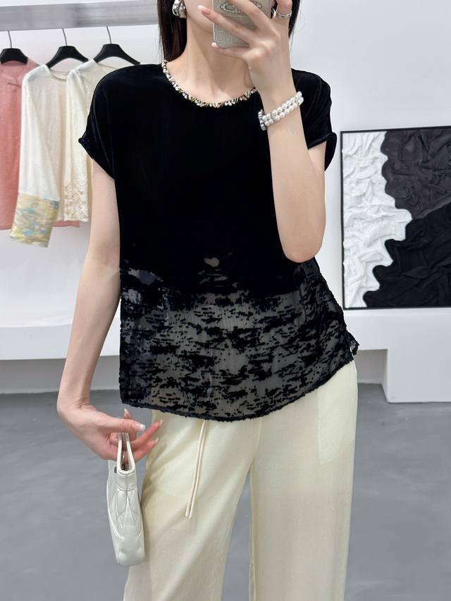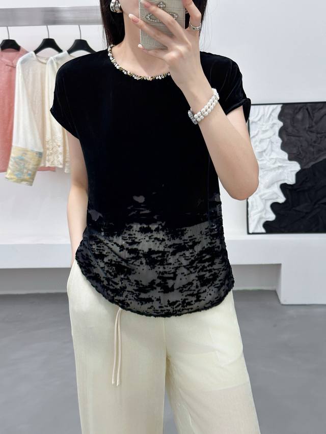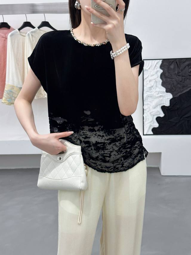 / New super running volume silk velvet positioning burnout top, round neck hand-s