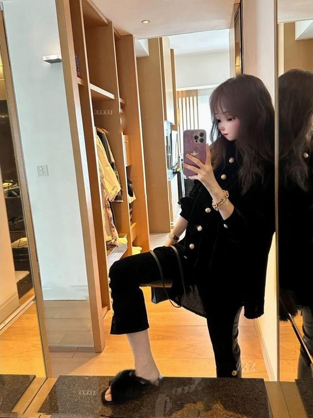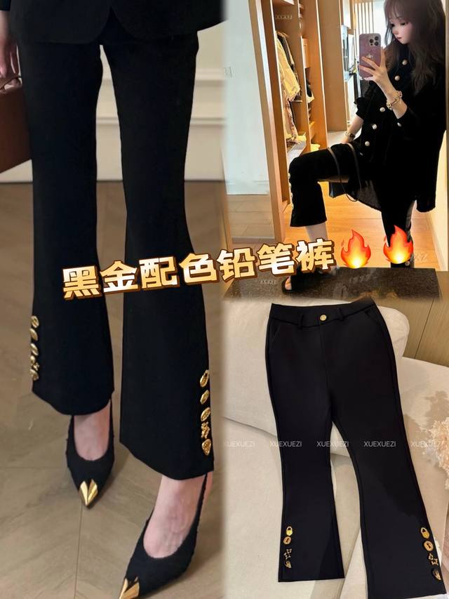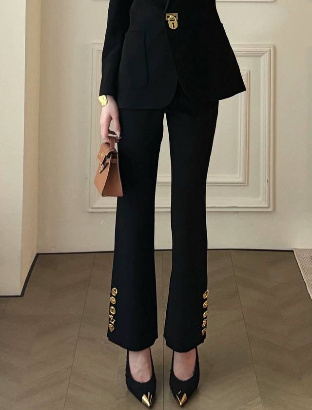 Niche design irregular single-breasted nine-point flared pants, custom logo buttons on the trouser legs, black and gold color matching is eye-catching, and the three-dimensional cutting style modifies the slimming and figure-enhancing Smlxl