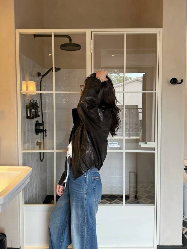 Old money style black protein leather motorcycle jacket
