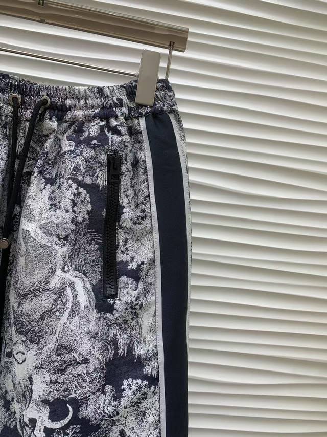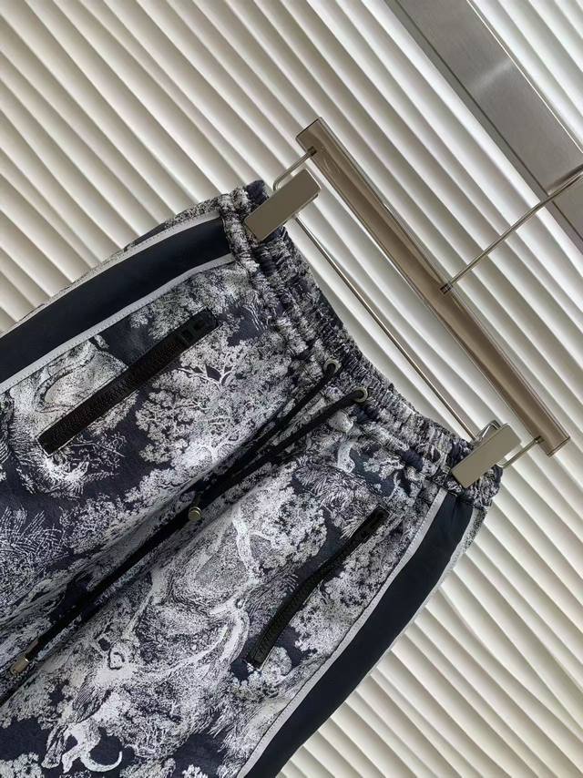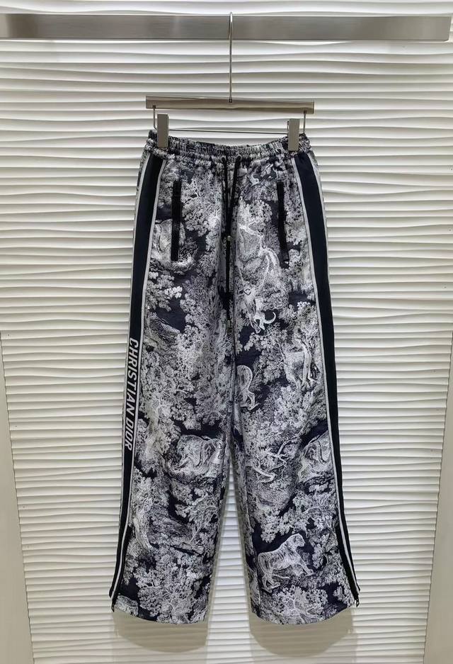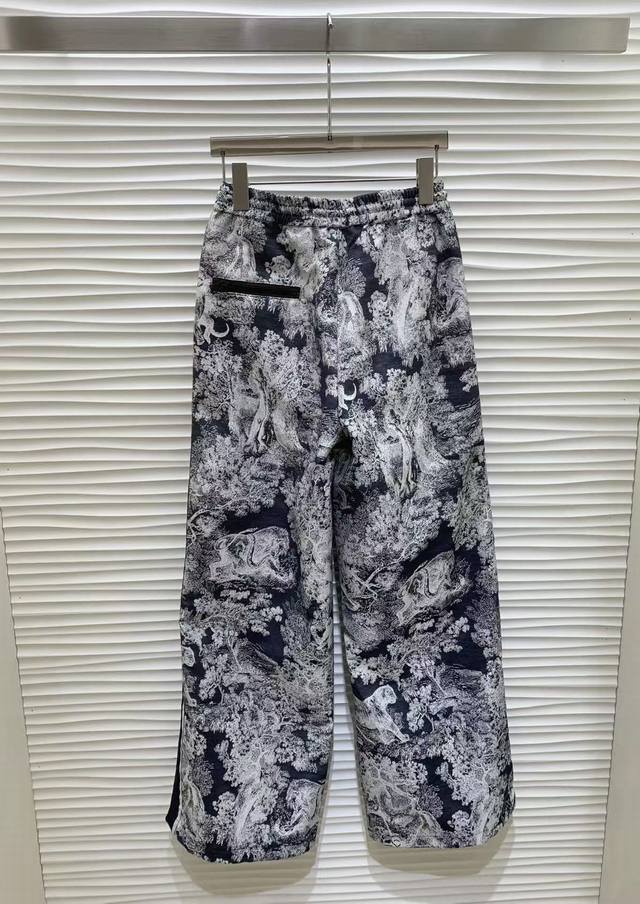 Original Dd.....2025 Early Fall New Fashion Jacquard Webbing Wide-Leg Pants. Custom YB imported jacquard trousers are crisp and stylish, featuring a rich texture. Allover prints of flora and fauna, natural jungle elements, highlight the brand's signature style. The elegant blue-gray colorway is complemented by side lettering and webbing embellishments for added dimension. Drawstring closure with zippered pockets and zippered slits on the legs offer flexibility and adaptability for a wide range of outdoor activities. Fabric and trims are developed with an elastic waist and straight-leg design. Pair with a matching jacket or coat to create a complete set, enhancing leg proportions and creating a stylish and stylish look. Original one color, size Sml.