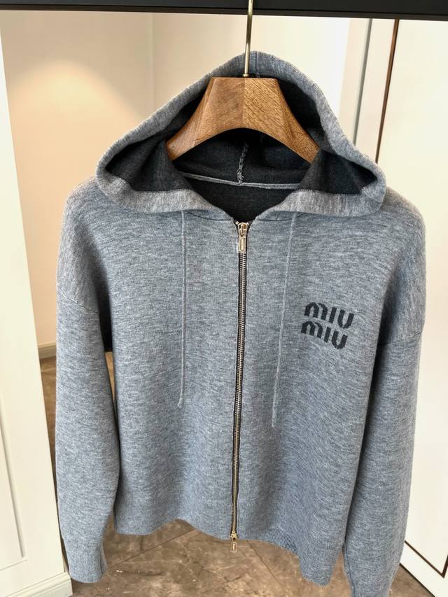 Original development series. 100% wool. 2025 new arrival, double-faced knit wool hooded zip-up cardigan. This iconic zip-up cardigan is redesigned in double-faced knit wool and embellished with the Miu intarsia logo, highlighting its modern and casual style. Wear it right in season. The hooded sweatshirt cut uses knitting techniques to create a lazy and casual look. Floral letters on the chest are paired with double zippers for a simple and stylish design. The top is clean and slim. The versatile cardigan has a double zipper design with versatile matching!