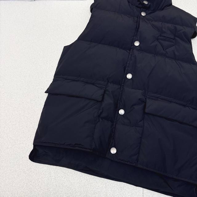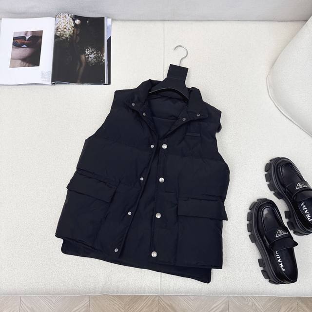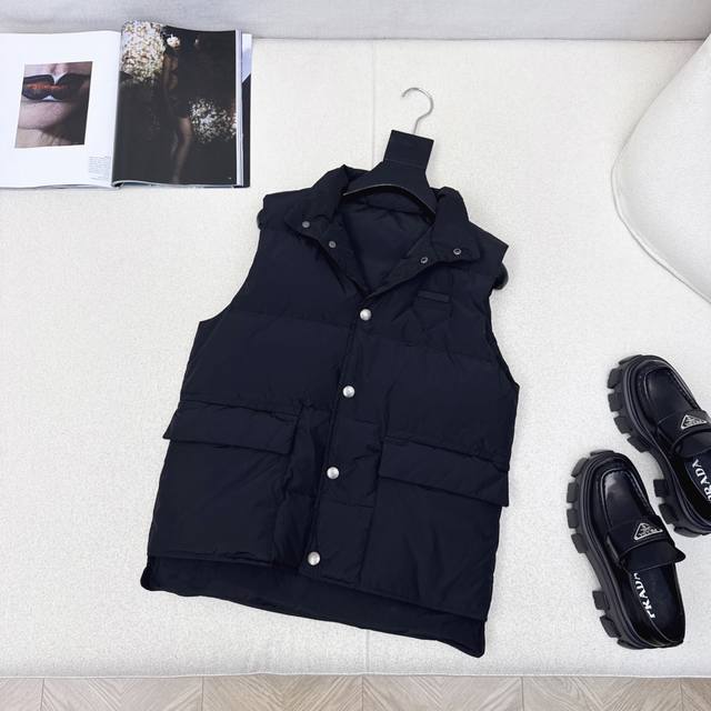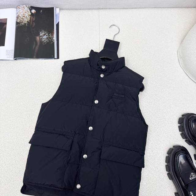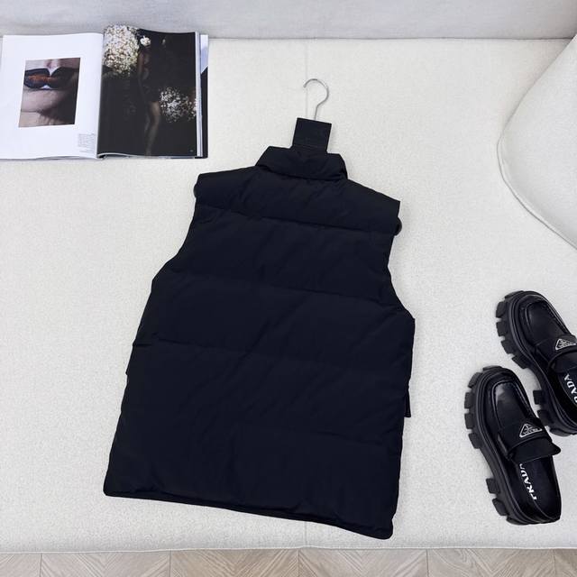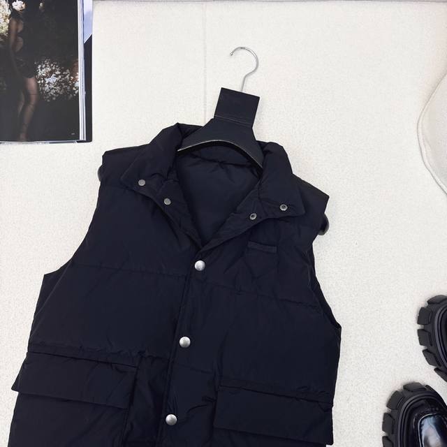 Original quality PD 25Ss Autumn/Winter latest stand-up collar workwear down vest, unisex classic H-line style, high visibility and practicality, super good-looking, filled with standard 90% duck down, excellent warmth, keeps you warm and avoids bulkiness. Yb hardware accessories + chest logo triangle decoration details are a big plus. Recommended. Two colors available now. Sizes 36, 38, 40. S: Chest 98cm, Length 62cm. Manual measurement may have errors.