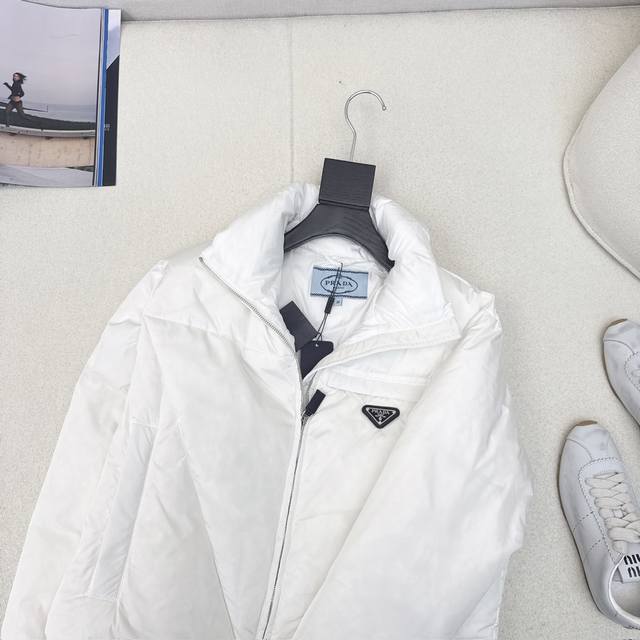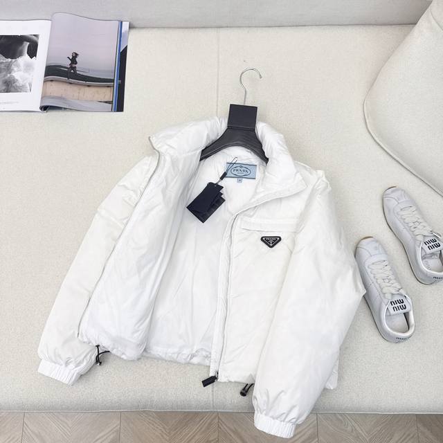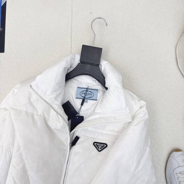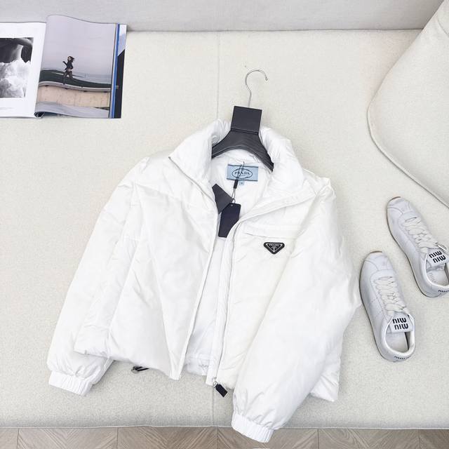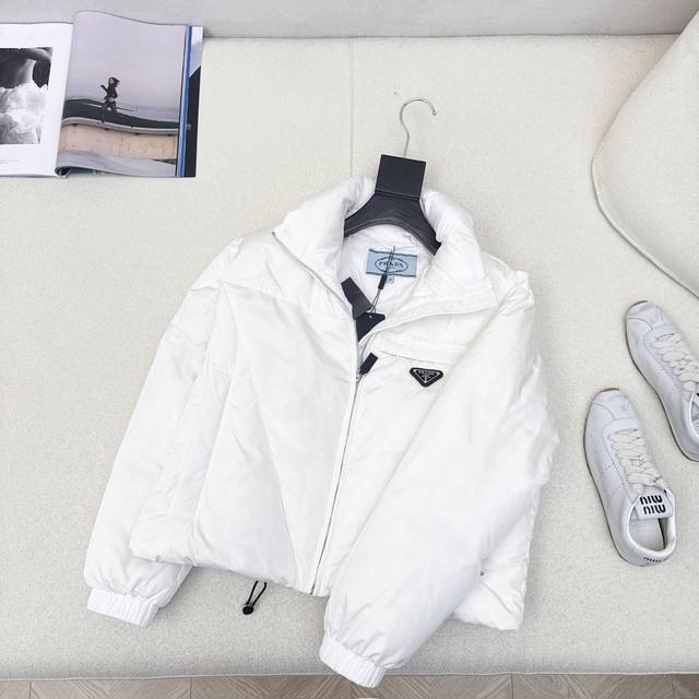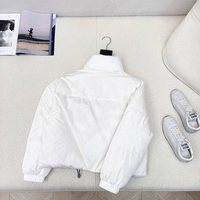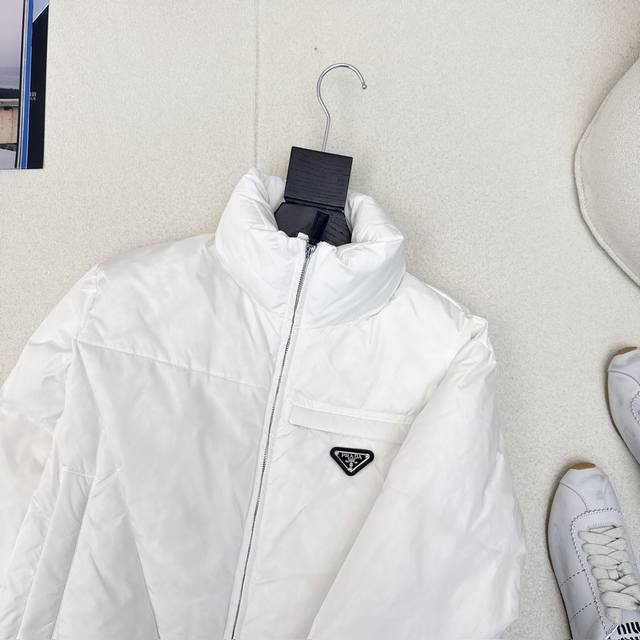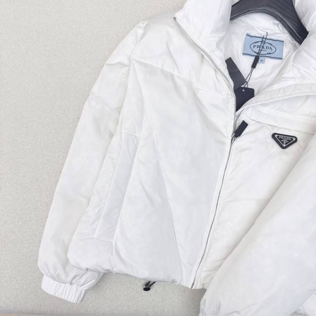 Original quality pd 25Ss new autumn and winter short stand-up collar down jacket with three-dimensional tailoring H-shaped, classic, fashionable and handsome original logo, letter logo, triangle logo decoration, national standard 90 white goose down filling, imported pure cotton fabric with superb texture, imported machine-sewn three-dimensional diamond-shaped pressing line craftsmanship, original hardware accessories, original label and complete accessories, two colors are available for sale in stock 38 40 42 44 S size: shoulder width 47 chest 114 length 51 manual measurement, there may be errors