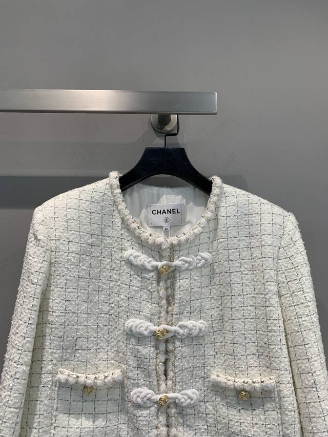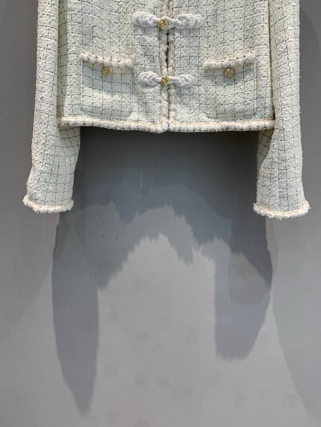 Originally developed by C-brand for the 2025 Early Fall collection, this short, Chinese-style buttoned tweed jacket features a distinctive design. The Chinese-style buttoned design creates a unique and elegant look, while the short silhouette elongates the figure. Made of classic tweed fabric, it features a 100% silk lining. Paired with a skirt for an elegant and refined look, or with jeans for a cool and stylish look, this iconic piece embodies the fusion of East and West. Sizes: 36, 38, 40,