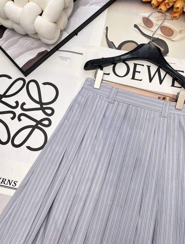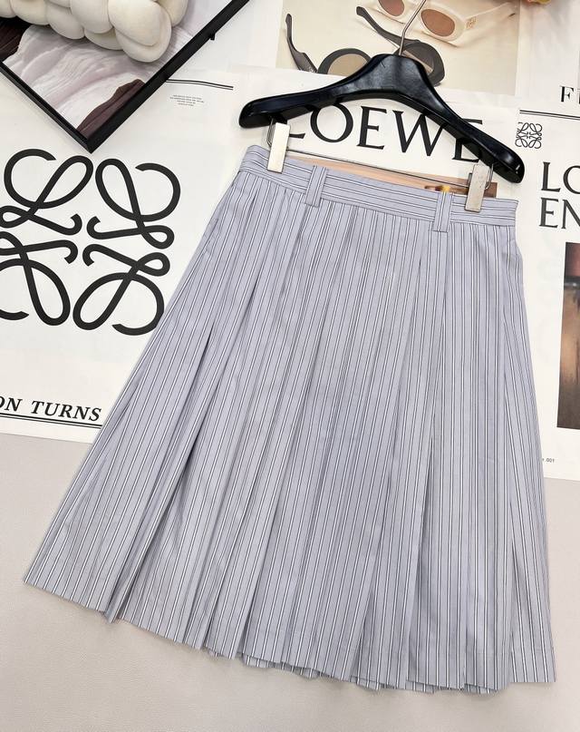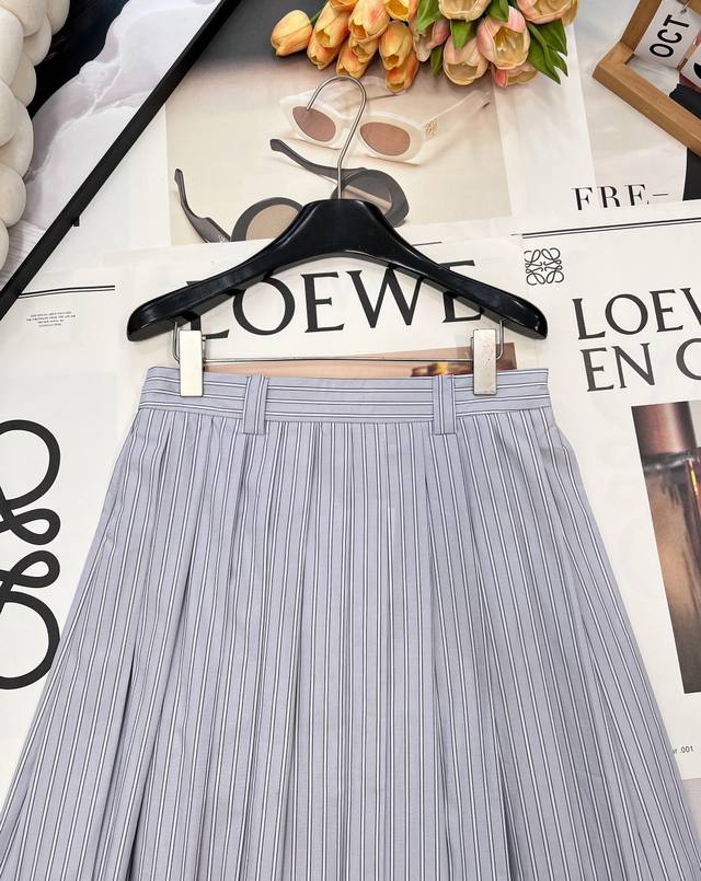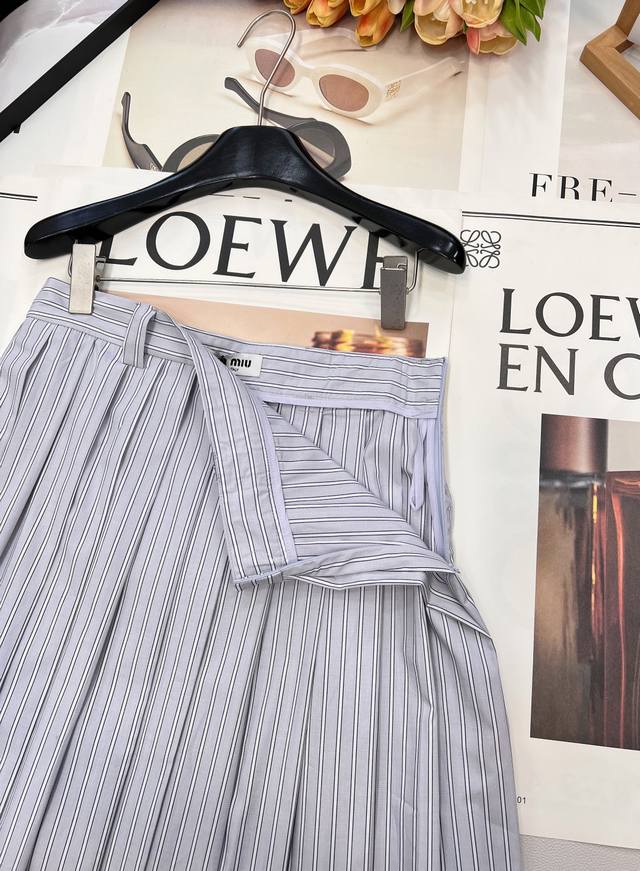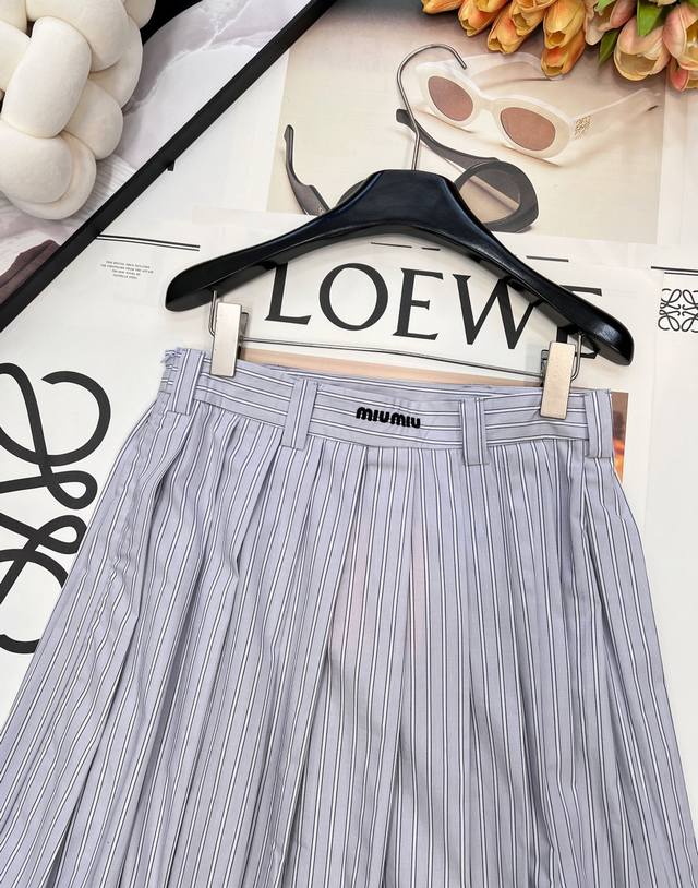 p280Miumiu 2025 New Striped Collar Jacket and Drawstring Skirt Set. Made of custom Yb twill cotton, this set offers comfortable wear and a stylish look. The collared shirt-style jacket exudes a fashionable style, featuring vertically arranged blue stripes throughout. The back buttons are detachable, and the hem has elastic ribbed trim for a flattering fit. An embroidered logo adorns the chest, showcasing individual style. Pair it with the matching skirt, an A-line midi length with a perforated belt and clean pleats, and an umbrella-shaped flared hem that flatters the legs. The complete set enhances the brand's appeal and is trendy. The entire lining is finished with binding and custom-dyed stripes for a perfect look, distinguishing it from other market versions. Custom-made materials are a must for those seeking quality. All three labels are complete. Bulk orders are available. Sizes: S, M, L, Ddd. Jacket code: M275, Ddd. Skirt code: M215, Ddd.