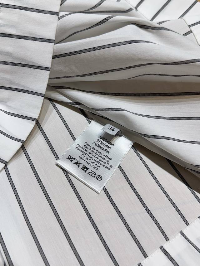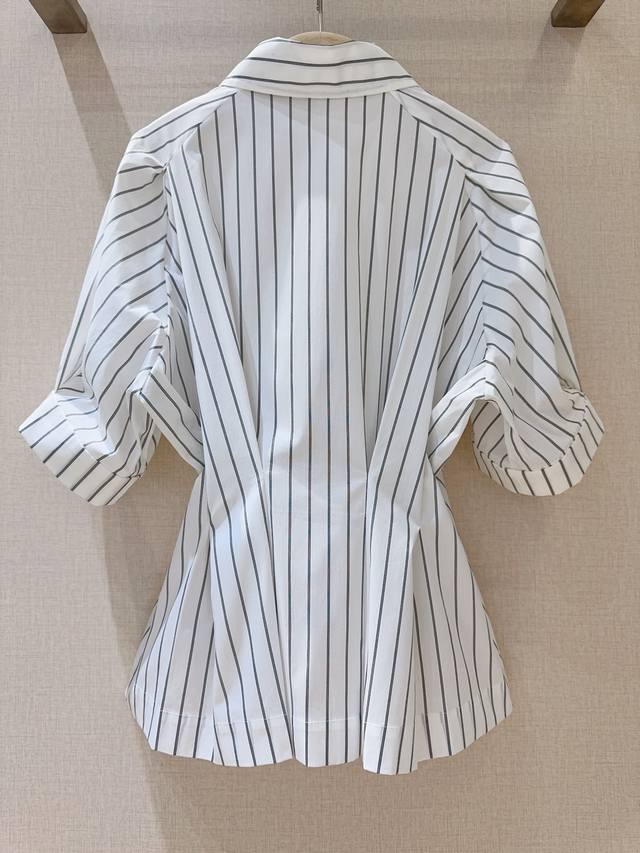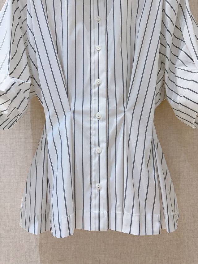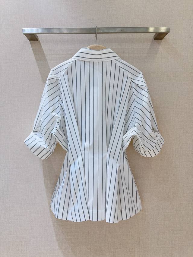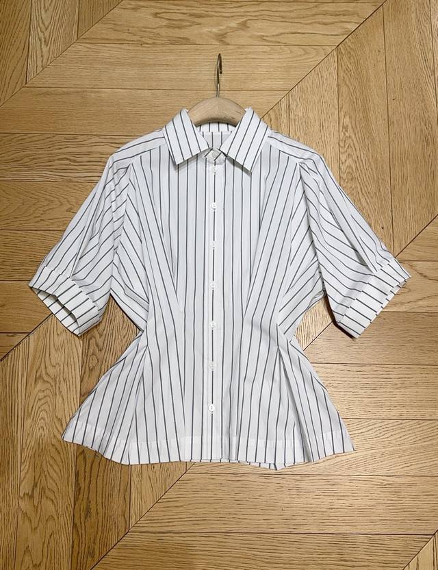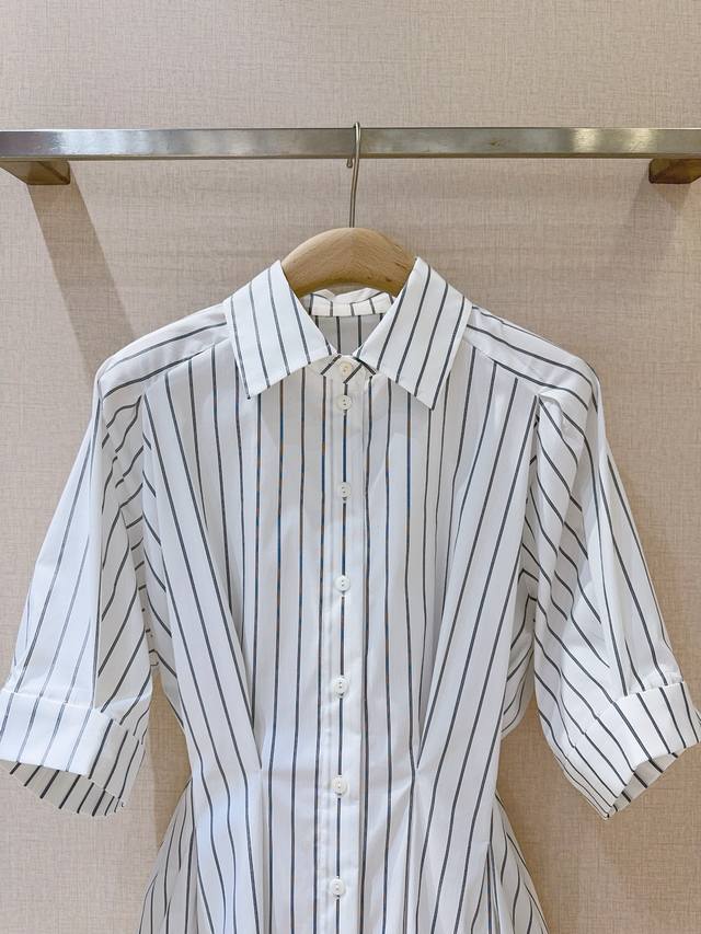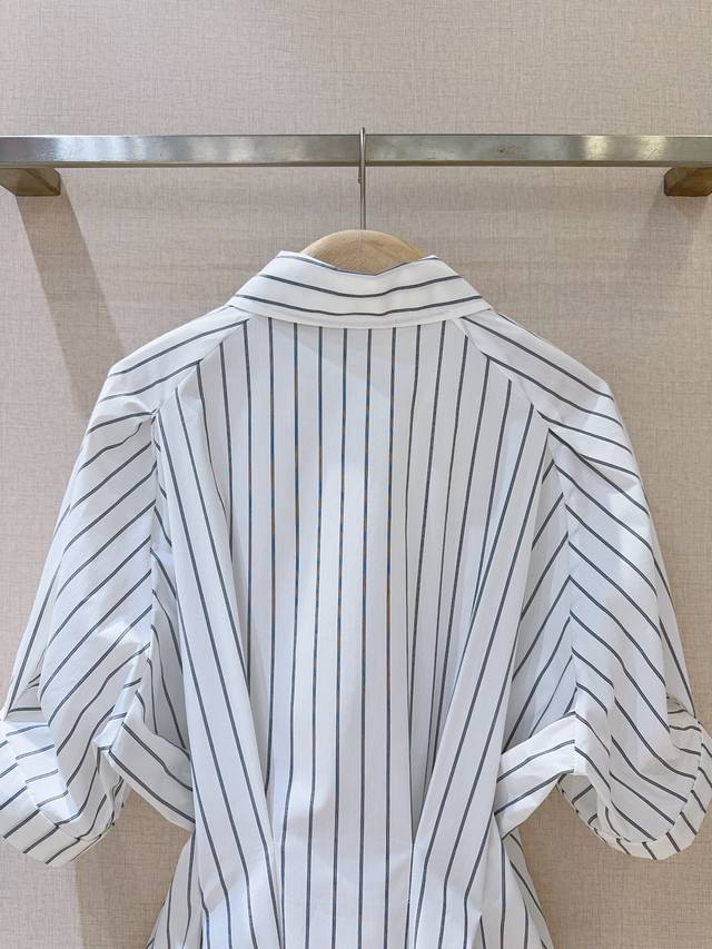 Short-sleeved collared shirt with a sophisticated striped waist. The classic collar paired with clean vertical stripes and a fitted waist cleverly accentuates the figure, balancing a relaxed yet tailored fit. Suitable for both work and everyday wear, effortlessly creating a stylish and sophisticated look.