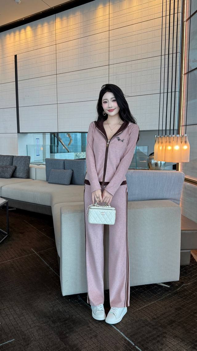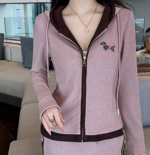 Pink khaki S~Xxl 5 sizes 2025 autumn and winter new arrivals, fashionable and stylish hot rhinestone dog color contrast hooded design casual sports suit, high-end and classy, straight-leg wide-leg pants are tall, slimming and leg-lengthening.