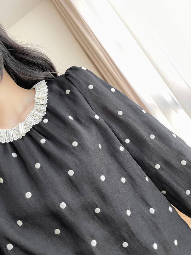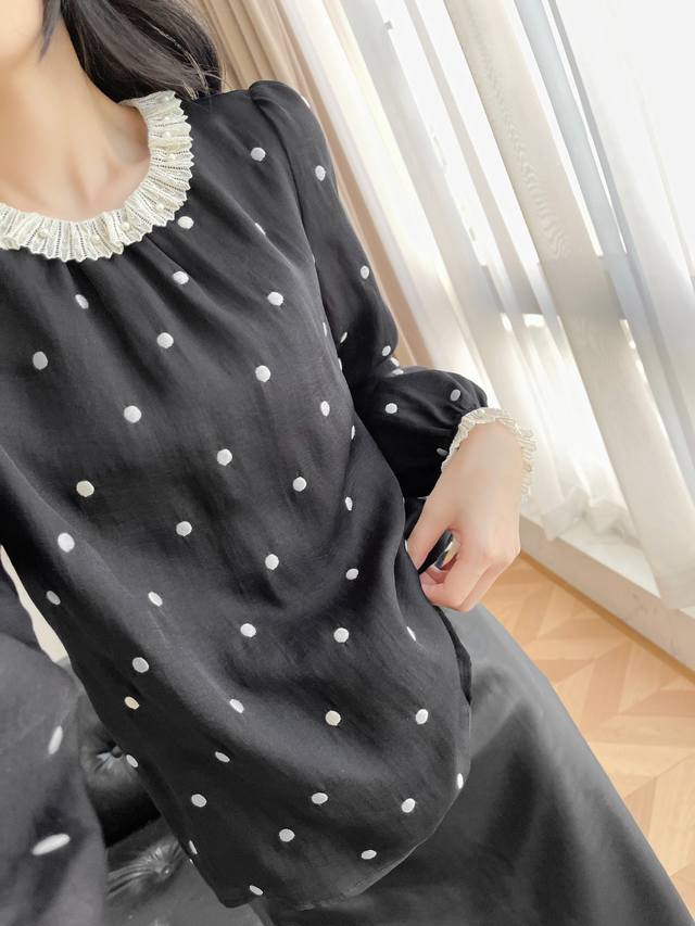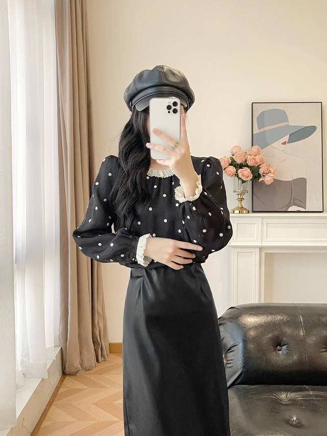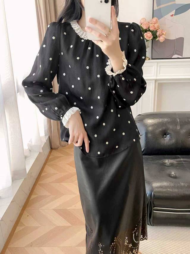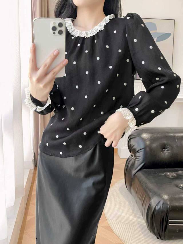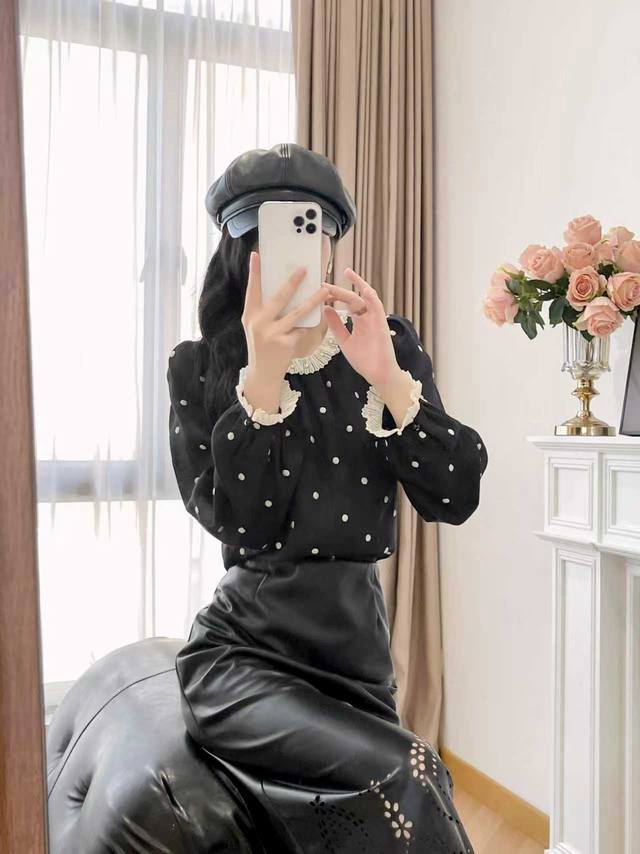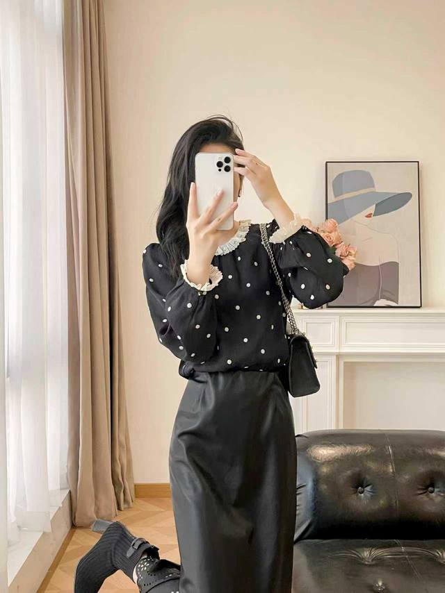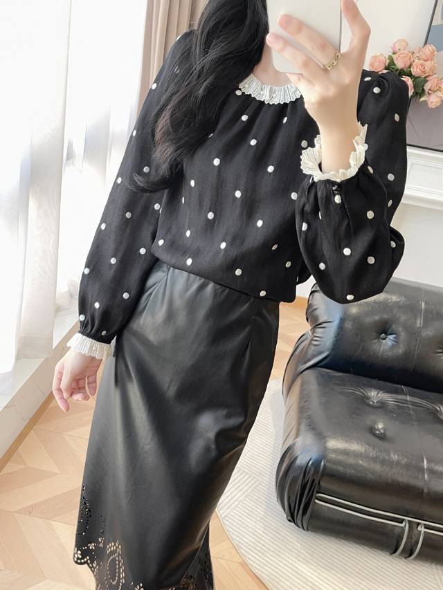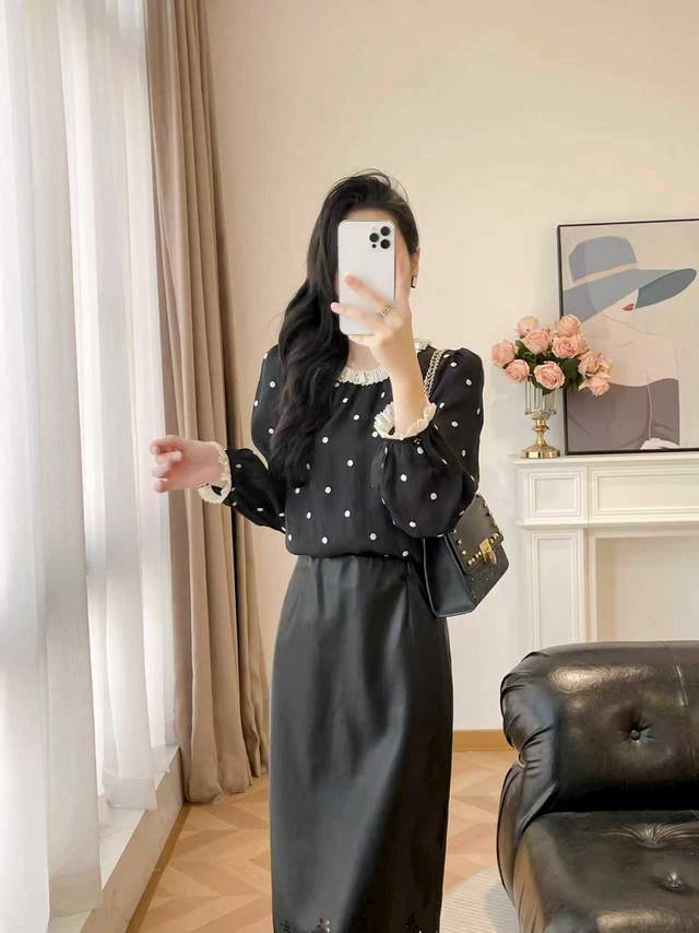 / Polka dot top and protein leather skirt, 2025 autumn/winter new style, Tencel p