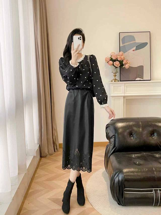 Polka dot top and protein leather skirt, 2025 autumn/winter new style, Tencel polka dot top + protein leather flocked skirt, S-XXL, in stock.