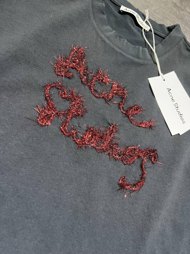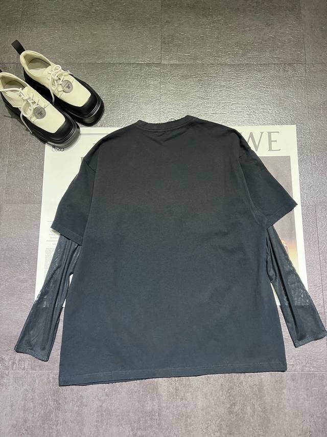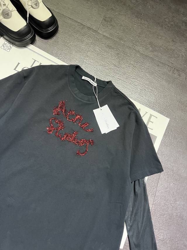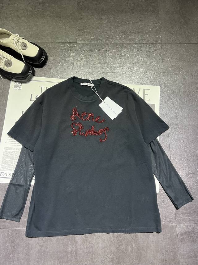 pp Acne Studi* New round neck metal letter logo embroidered faux two-piece loose long-sleeved T-shirt, couple style, shipped, oversized fit, model wearing it, pants also available, one set shipped, looks great on, in stock Sml DDD