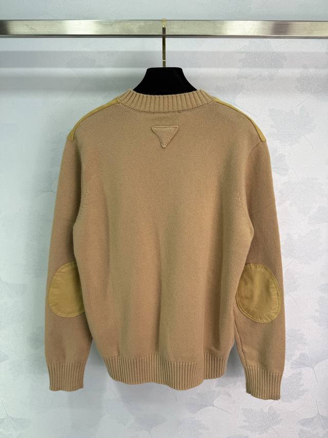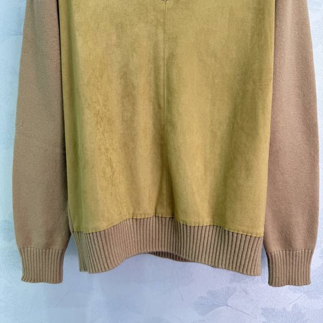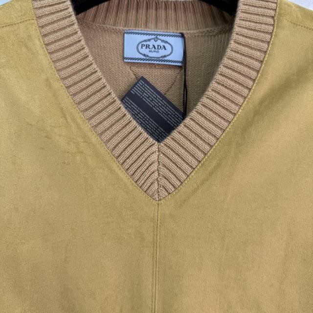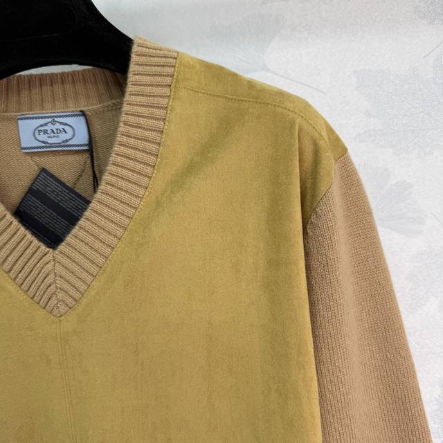 pr*25 New Early Fall V-neck sweater. Made of tan suede and khaki knit fabric. Classic V-neck design. Simple logo embroidery on back. Made of premium wool with a smooth, soft feel. Slimming, versatile, and stylish. Available in 3 sizes (Sml