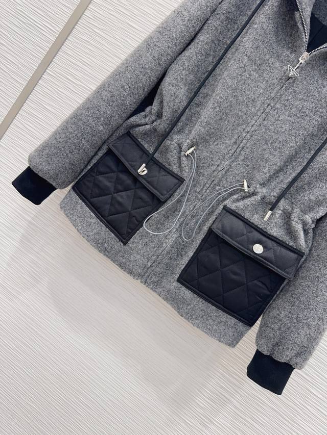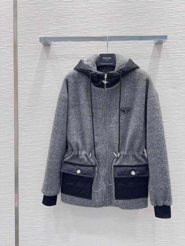 prad* 2025 Autumn/Winter New Hooded Jacket, high-end and sophisticated design, classic logo triangle on the chest, drawstring waist for a slimming effect, Sizes S, M, L. S: Back length 66cm, Shoulder width 52cm, Chest 102cm. DDD