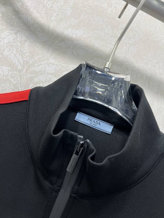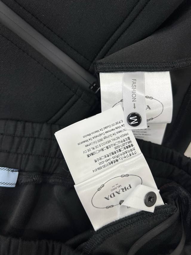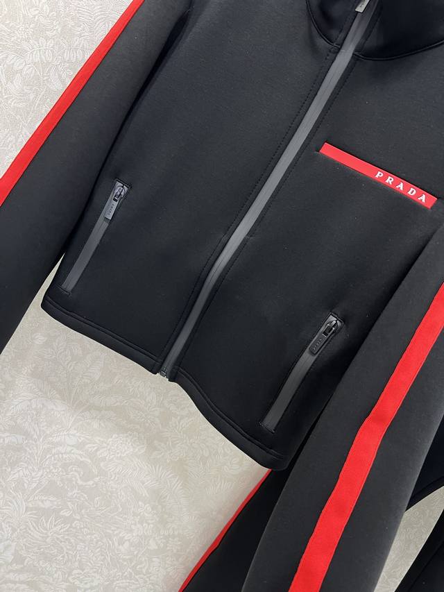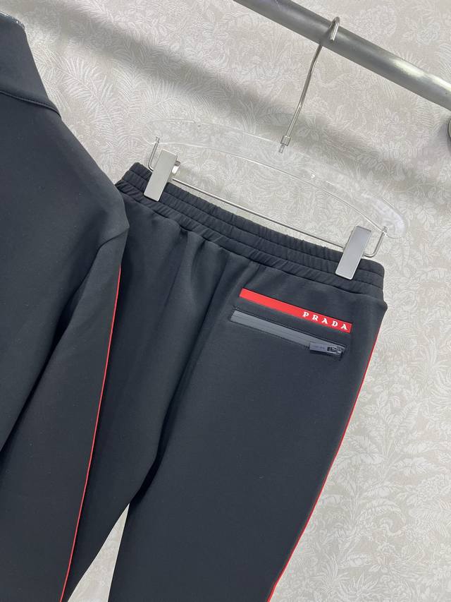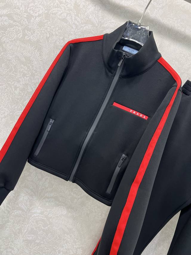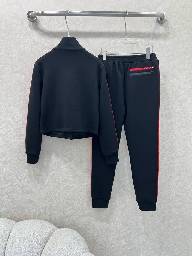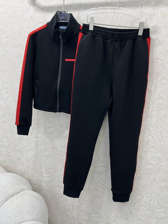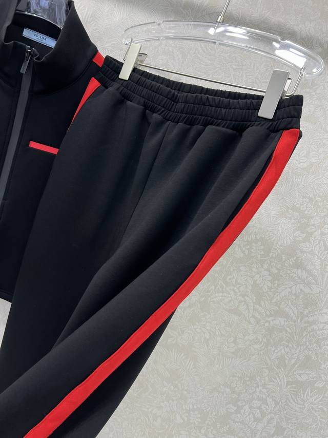 prad* 25 New red-label space cotton jacket and cuffed pants combination. Red webbing on both sides. High-end black and red color matching. Eye-catching and beautiful letter logo plastic patch on the chest. Custom hardware. Warm without being too bulky. Fashionable and casual design. Perfect for everyday wear. Solid color. 3 sizes Sml B.