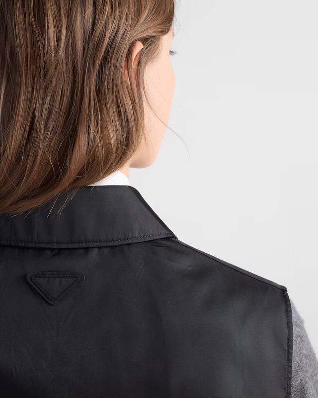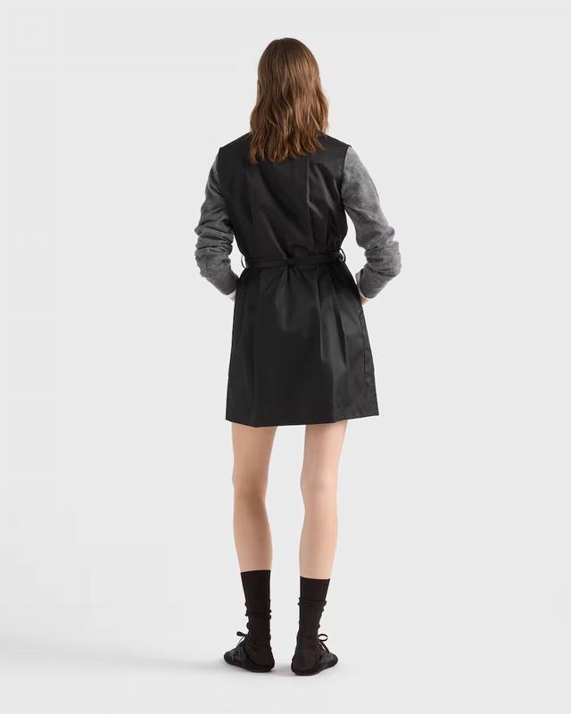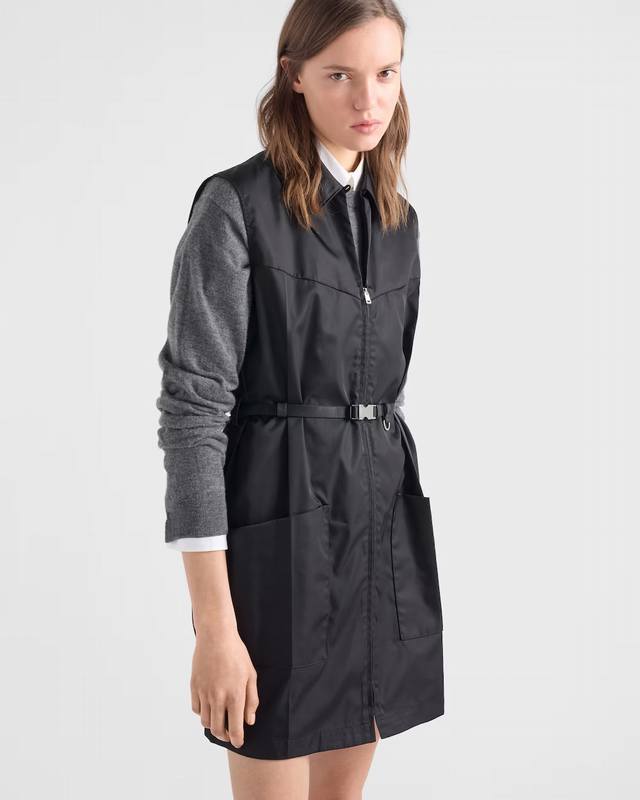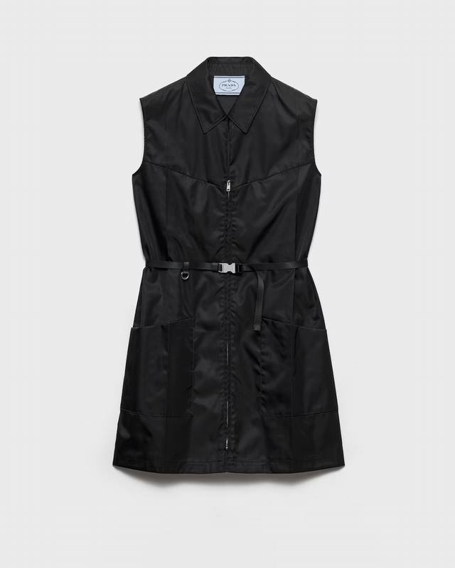 prad* 26Ss Early Spring New Recycled Nylon Mini Dress | Exclusive Yb Development! Top-Tier High-Quality Production! The signature recycled nylon fabric presents a matte, high-end texture. The black tone exudes understated coolness. The collared, sleeveless, workwear-style cut features a zipper closure for easy wear and versatile styling. The half-zipper creates a casual V-neck effect. The lead-buckle belt cinches the waist, outlining a clean X-shaped silhouette, softening the relaxed feel of the loose fit and highlighting the figure. A perfect early spring wardrobe essential that combines design, practicality, and eco-friendliness. Available now in sizes S, M, L, D.D.