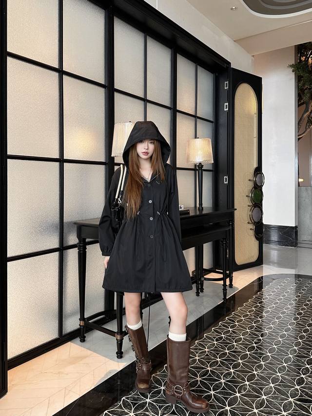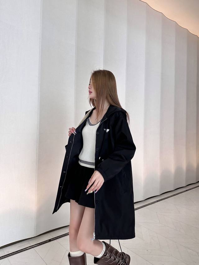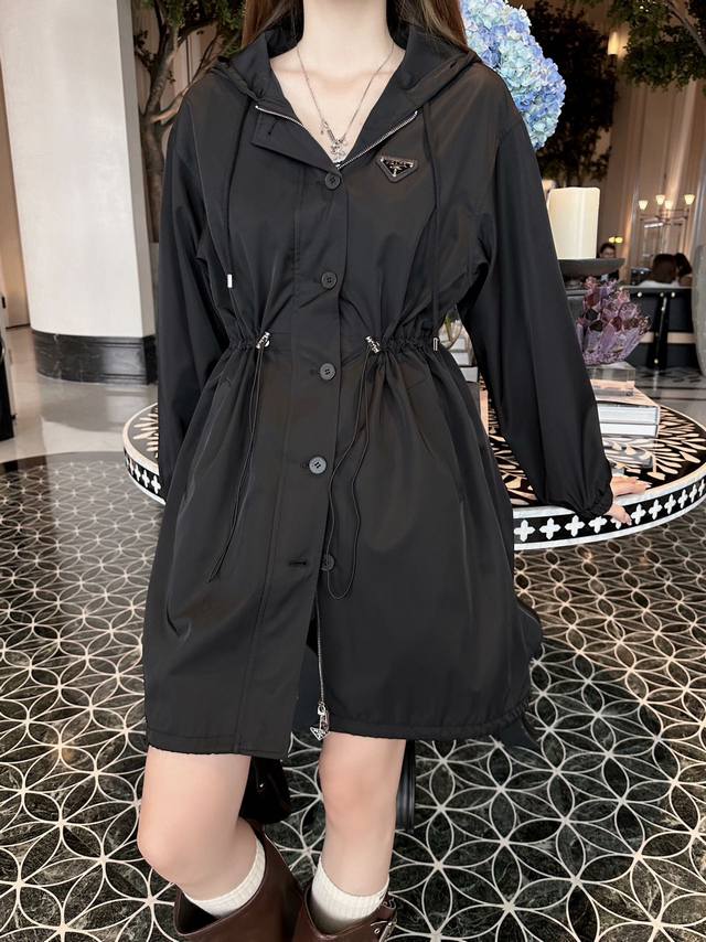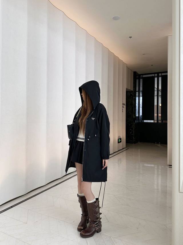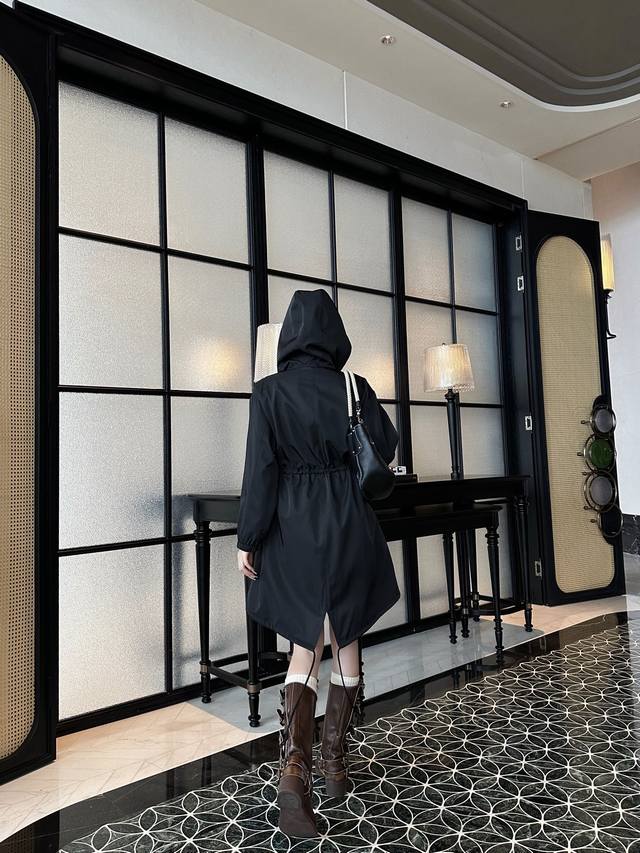 prad* Hooded long coat. Drawstrings at the waist and hem allow for easy adjustment of the silhouette. Decorated with a metal triangle logo. Black khaki.