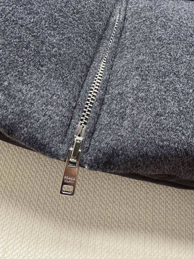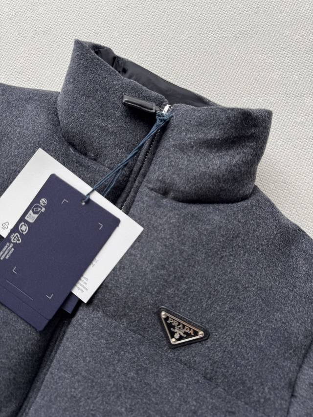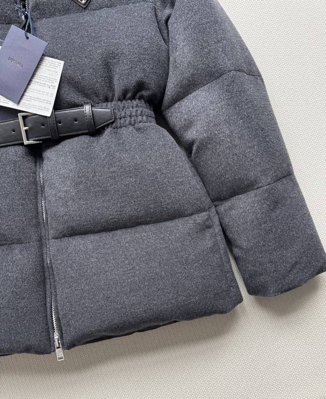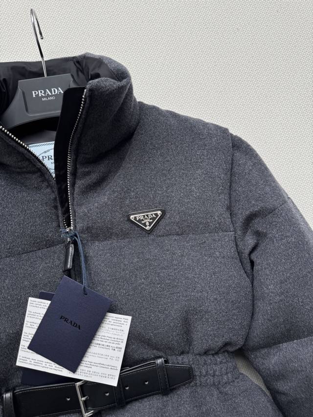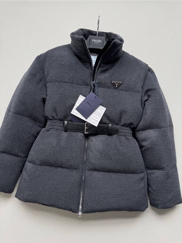 prad* New mid-length down jacket with a waistband, hood, duck down lining, stand-up collar and cuffs with elastic, zipper and button closure, zippered welt pockets, elastic drawstring hem, enameled metal triangle logo, and a top that accentuates the waist. This style is perfect for any outfit. SML.