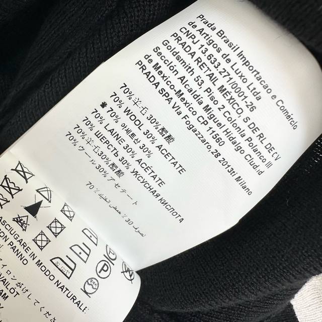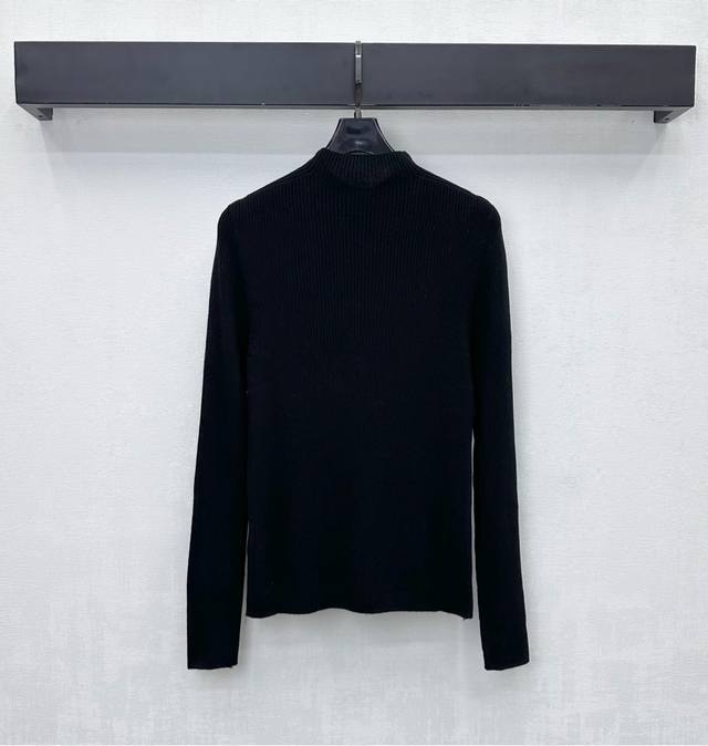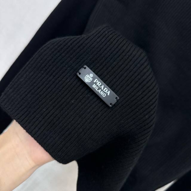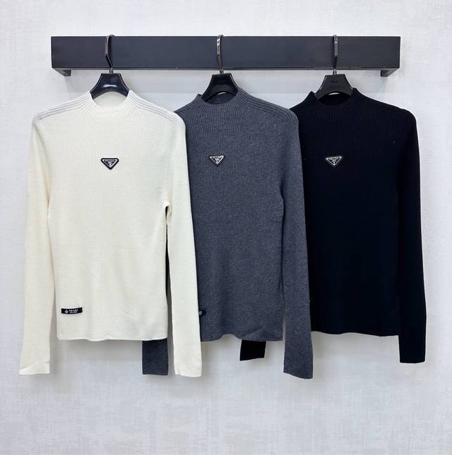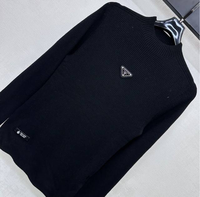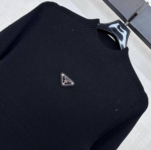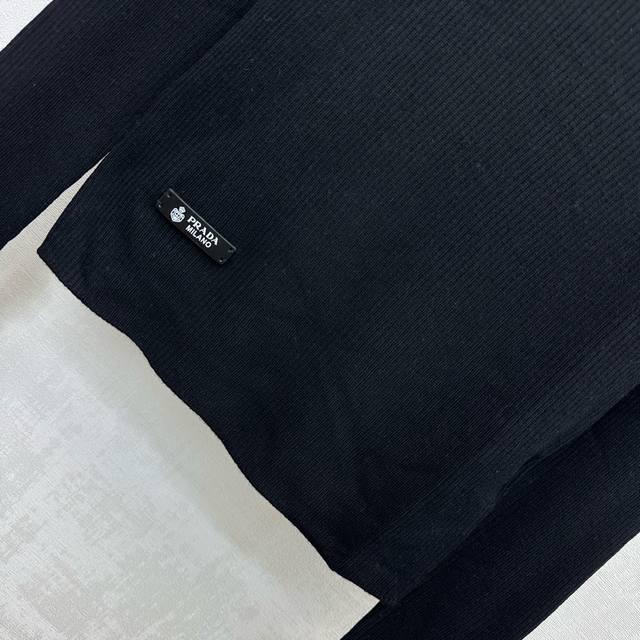 prad*2025 New Arrival: Crew Neck Logo Base Layer Shirt, Custom Made with Imported Fine Wool, Clear Wool Texture, Comfortable and Skin-Friendly. The centrally located iconic metal triangle logo on the chest highlights the brand's style. Side letter leather labels on the hem add a touch of sophistication. Knitted crew neck with bound edges, highly elastic fabric. Crew neck long-sleeved top with a slim fit. Wear alone or as an inner layer for a high-end and fashionable look. High-quality version, 3 colors available.