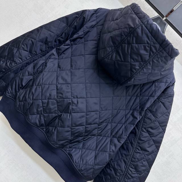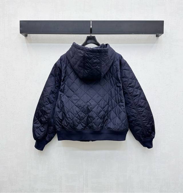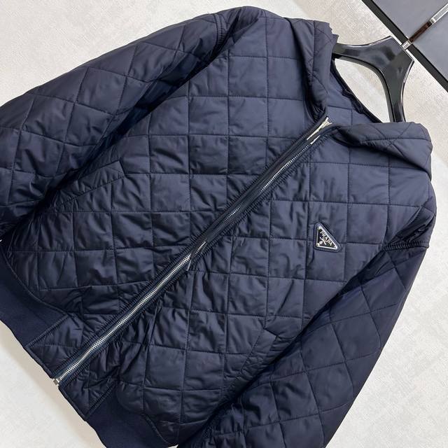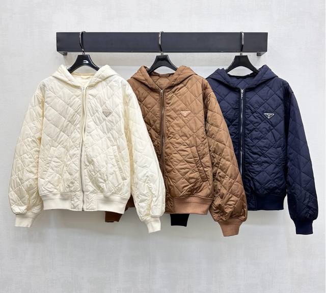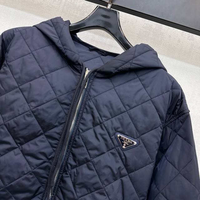 prad*2025 New Arrival: Custom-Made Diamond-Patterned Hooded Cotton Jacket Made of Imported YB Windproof and Waterproof Nylon, High -Quality, Lightweight and Warm. Embossed diamond pattern throughout, with symmetrical hand-strap pockets for increased hand warmth and practicality. Embossed pattern on the lining adds layered detailing. Signature triangular logo embellishment on the chest highlights the brand's tone. Developed fabrics and accessories. The hooded jacket's tailoring eliminates dullness, combining warmth and style. High-quality edition in three colors.