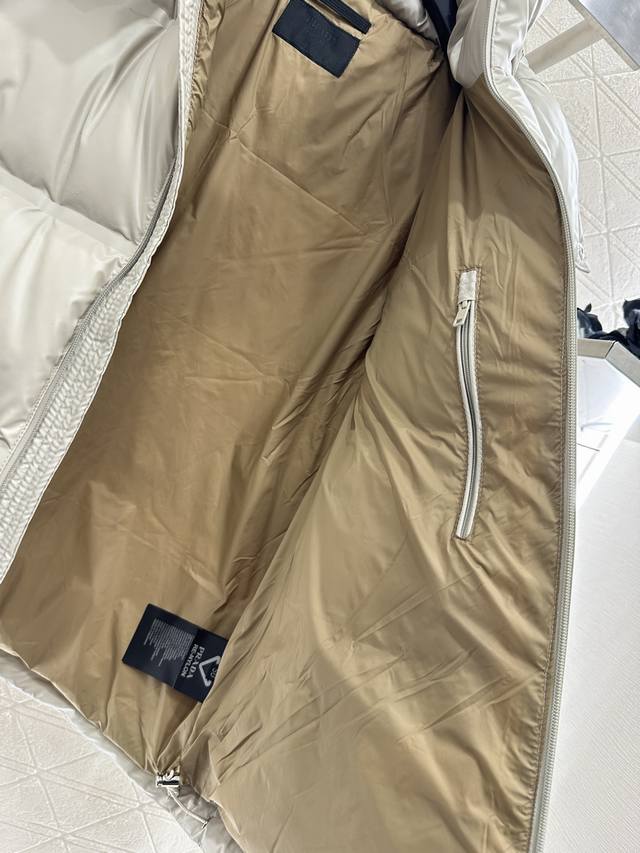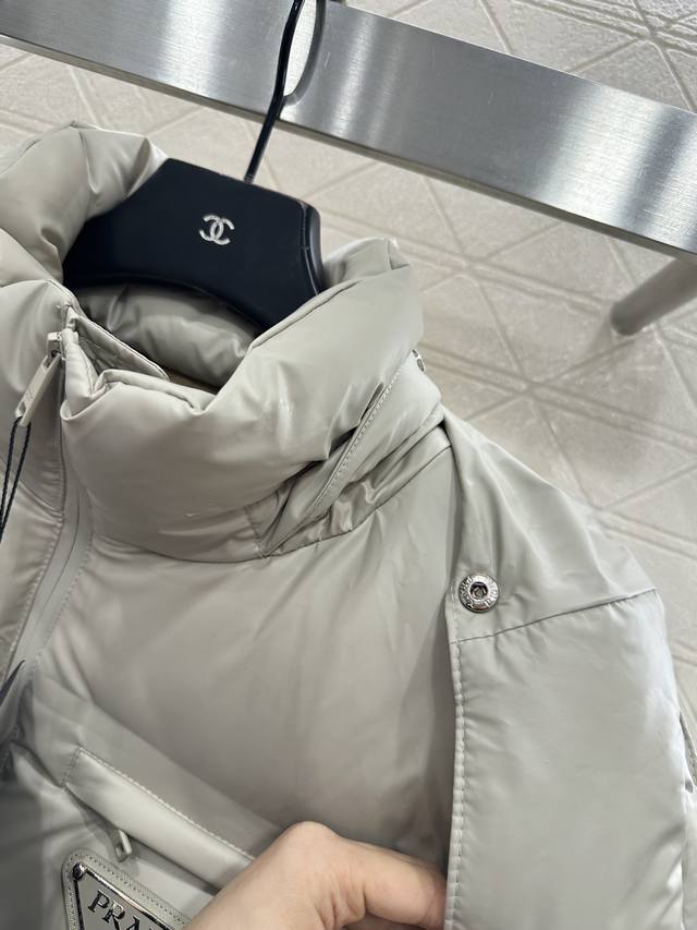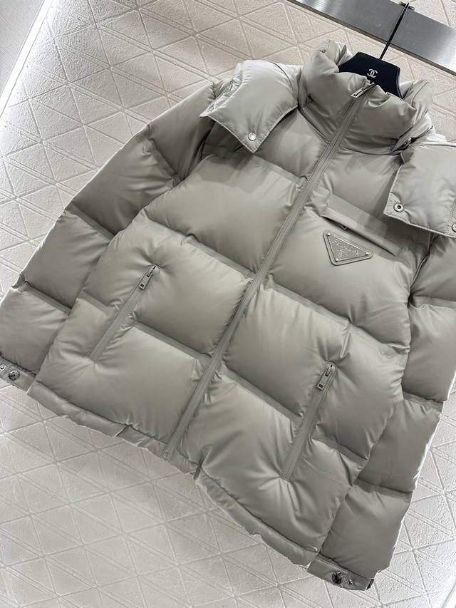 prad*2025 New Arrival DDD Hooded Detachable Down Jacket DDD Custom Yb imported reflective windproof and waterproof nylon material, replicating the original craftsmanship, upgraded material, enhanced autumn and winter warmth, white goose down filling, lightweight and warm, stand-up collar and detachable hood for two-way wear, rectangular embossed torso, layered with a triangular logo on the chest and zippered pockets, creating a rich and varied design. The reflective glossy finish throughout is technologically advanced, showcasing a low-key yet sophisticated feel, while the added zippered pocket detail inside successfully breaks away from the dullness, combining warmth and style. Customized fabric and accessories, please check the version. Filling standard: National standard 90% down. Filling material: High-quality white goose down, 2 colors, 48.50.54.56. DDD