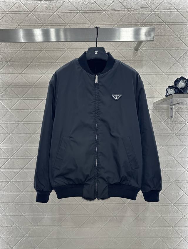 prad*2025 New Arrival Ddd Reversible Eco-friendly Fur Down Jacket Ddd Custom Yb Imported eco-friendly fur windproof and waterproof nylon material, down-filled lining, reversible design for easy style switching, luxurious fur and understated nylon, lightweight and warm, baseball-style ribbed zipper opening design for enhanced warmth, triangular metal logo on chest for individuality and style, versatile in black and white for autumn and winter, easy to match with any outfit, the silhouette is chic and stylish. Customized fabric and accessories, look for the high-quality version, 2 colors: black and white DDD