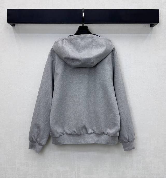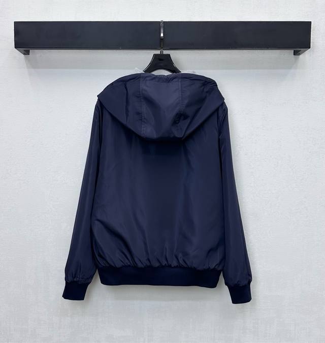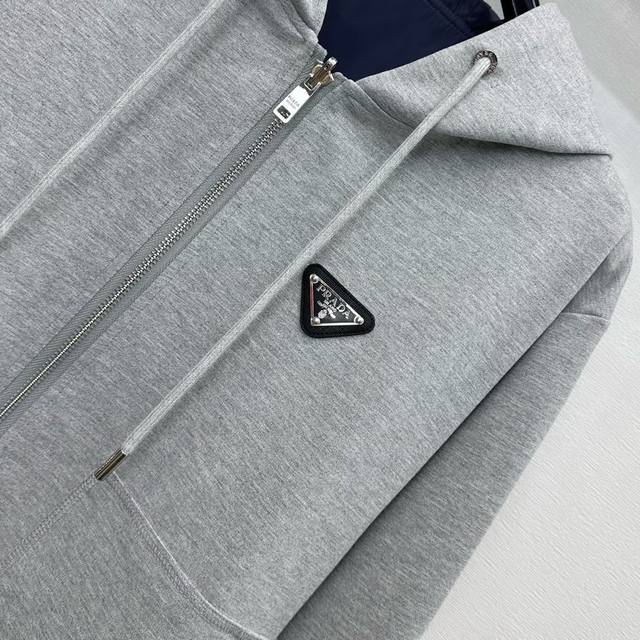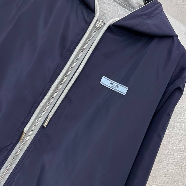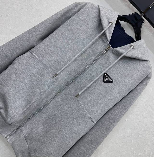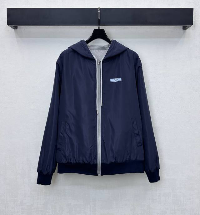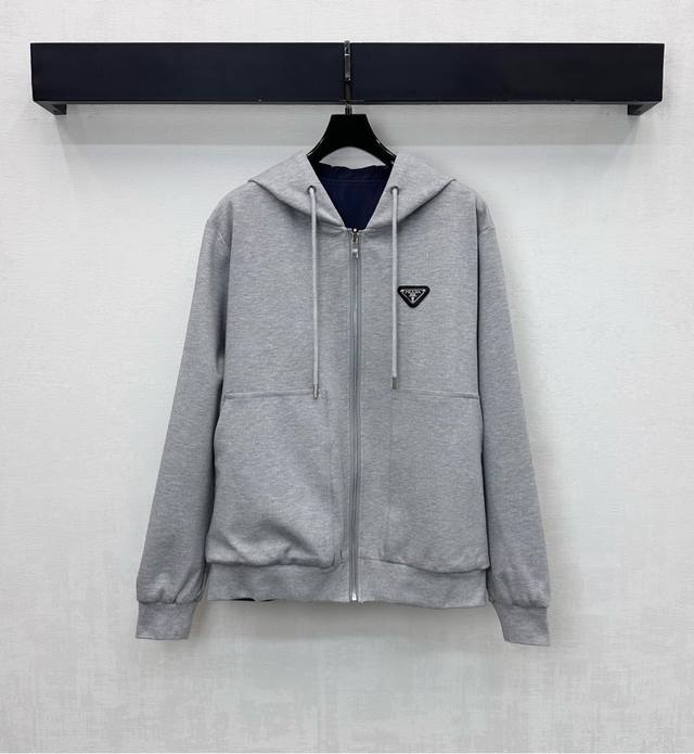 prad*2025 New Arrival: Reversible Hooded Jacket and Pants Set, Custom Made with Imported Original Cotton Nylon. The hooded drawstring zipper jacket features a solid color design with the iconic triangular logo on one side and solid color nylon with letter patches and square logos on the other , adding a sense of style and layering. Two ways to wear, switching styles for a more eye-catching and fashionable look that reflects the brand's identity. The hooded zipper jacket is paired with matching jogger pants for a casual and chic look. High-quality version available in two colors.