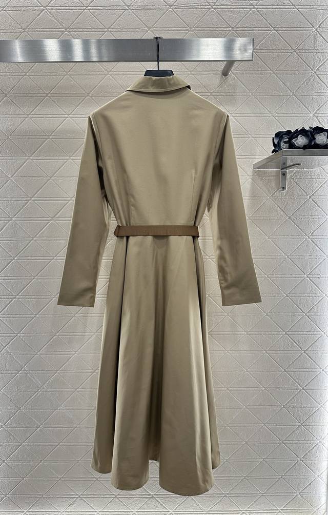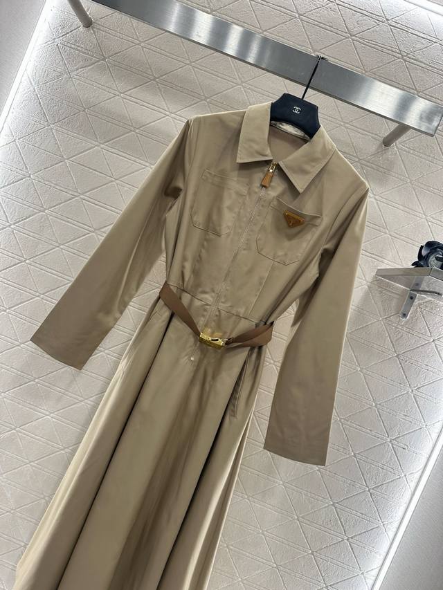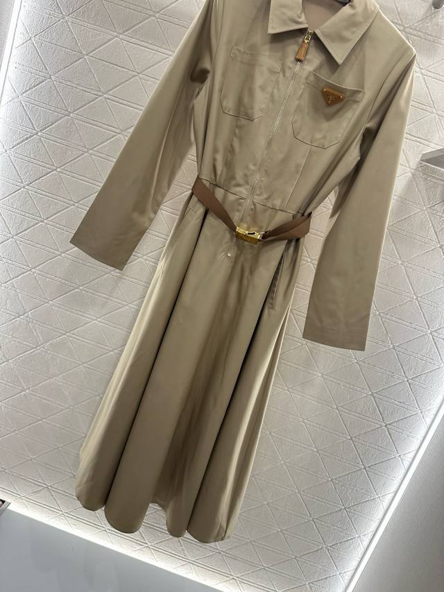 Custom Yb imported rayon, breathable and drapes smoothly and comfortably. The lapel dress silhouette features a zippered half-open placket. The solid color scheme is simple and durable, with a three-dimensional waistband, an adjustable belt, and an umbrella-shaped skirt. The dress is full of volume, eye-catching, and elegant. The triangular metal logo on the pocket embodies the brand's high-end style. The tailoring ensures a smooth drape. This dress is both fashionable and practical, perfect for all seasons. Pair it with a fur or down jacket in autumn and winter, or wear it alone in spring and summer, perfect for a sophisticated woman. For custom fabrics and accessories, look for the high-end version in two colors.