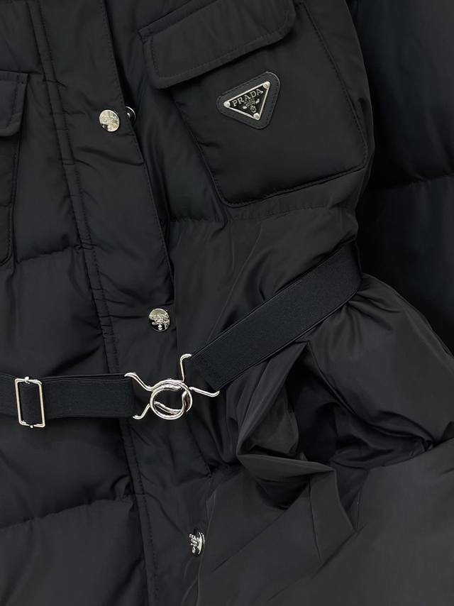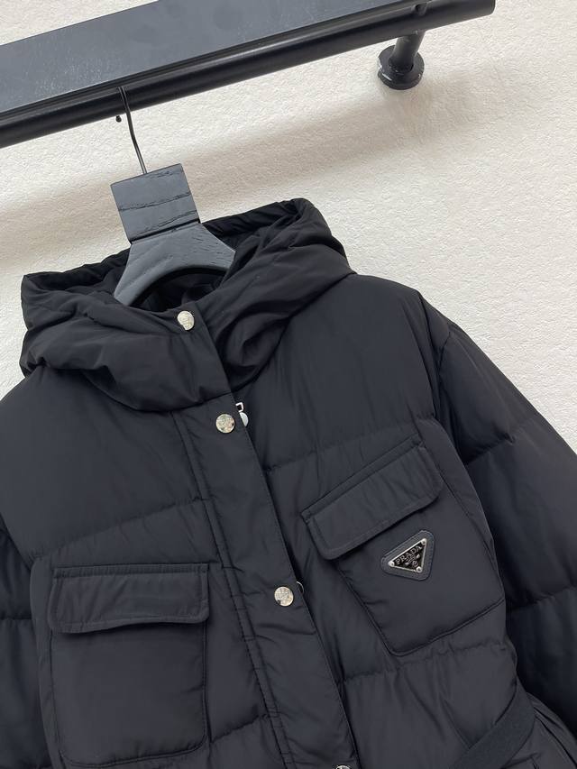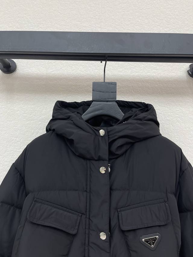 prad*25 Autumn/Winter New Style Slim Fit Hooded Down Jacket. Simple yet stylish, fully padded, lightweight and warm. Features signature triangular pockets with custom-made triangular enamel hardware, showcasing exquisite craftsmanship! Elasticated waist, drawstring hem, simple, chic, and cool! Sml Aa. DDD