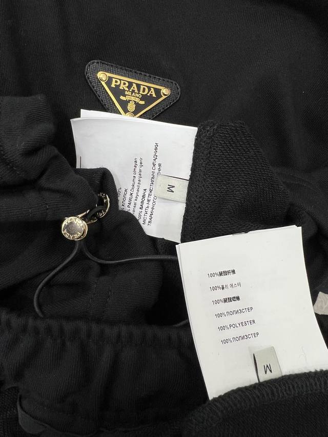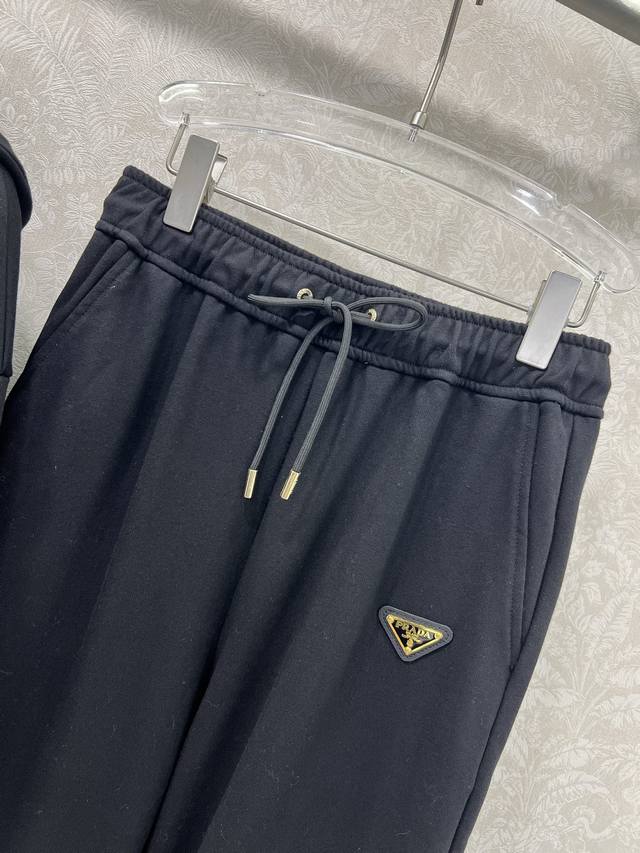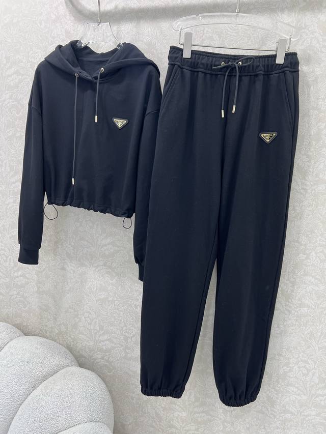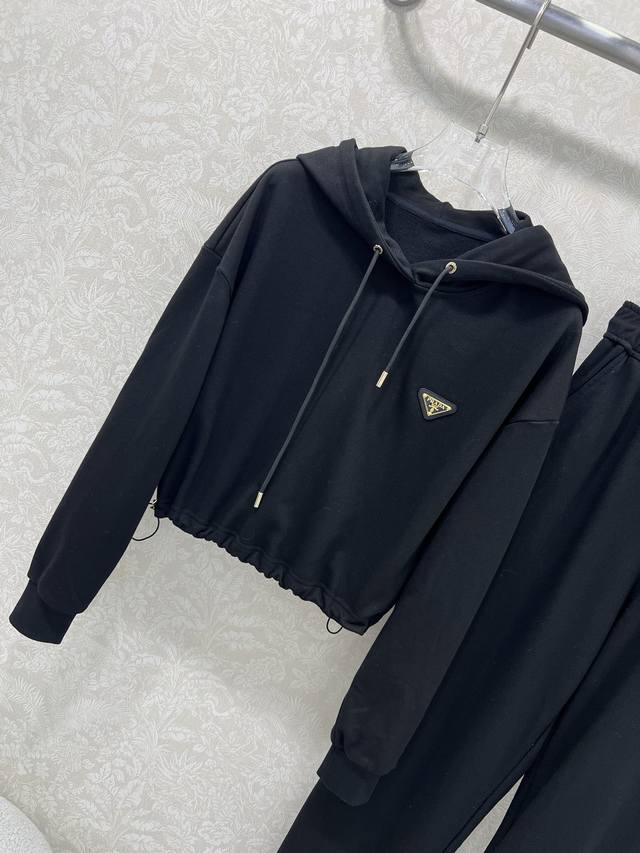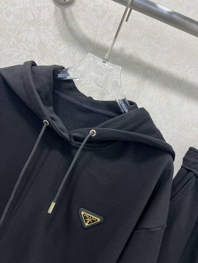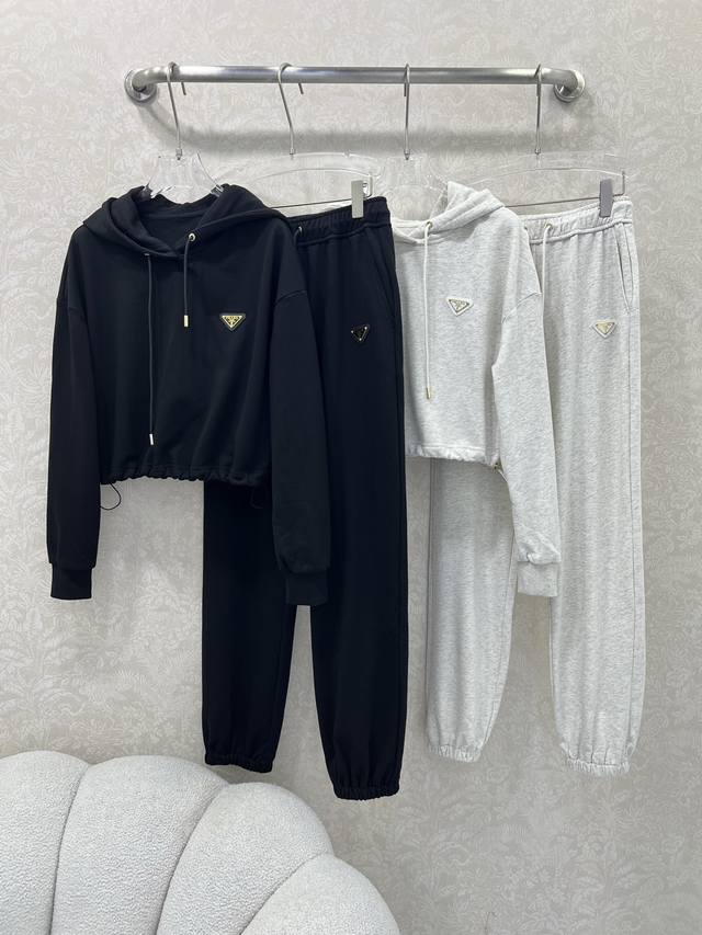 prad*25 New early fall set, hooded sweatshirt, and cuffed trousers. The top features a classic triangle logo, casual, retro, and stylish, with a simple, sporty silhouette. A must-have for lazy people, it instantly creates a sweet, cool, and rebellious girl vibe. Whether it's for daily leisure or commuting, the special yarn and custom fabric create a cuffed trousers that instantly enhance the casual and sporty atmosphere. High-quality, look for the complete set in 2 colors and 3 sizes. Smlb