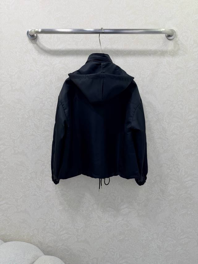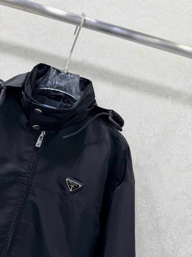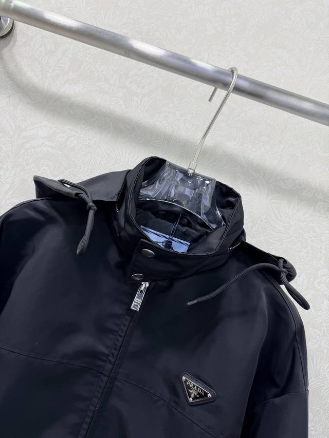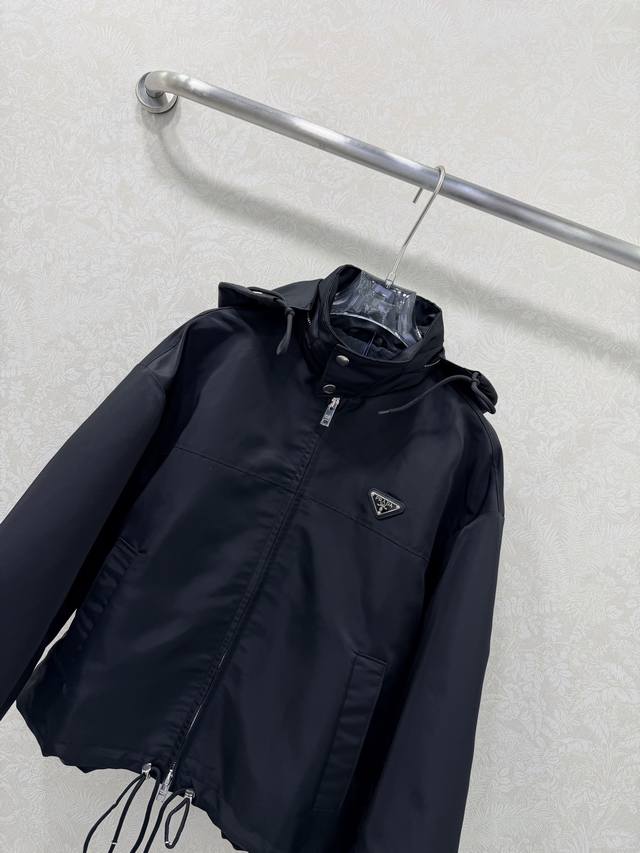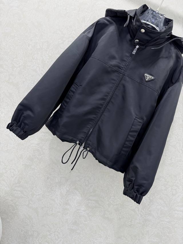 prad*26 New style, detachable hooded drawstring, windproof and waterproof nylon material, crisp and stylish, high-quality feel, windproof, detachable hooded drawstring design, two ways to wear, creating a tall and slender look as well as a casual style. The classic triangular metal logo on the chest highlights the brand positioning, while symmetrical pockets on both sides brighten the look. The drawstring allows for adjustable tightness, creating an elegant silhouette. Perfect for everyday layering, trendy and fashionable. Custom fabrics and accessories, please look for the version, single color, size 3 Smlb. DDD