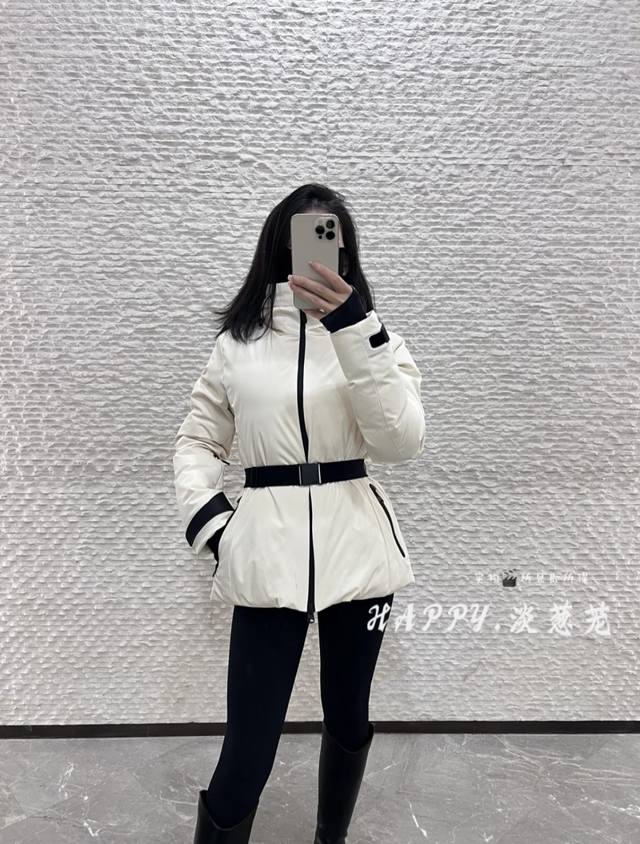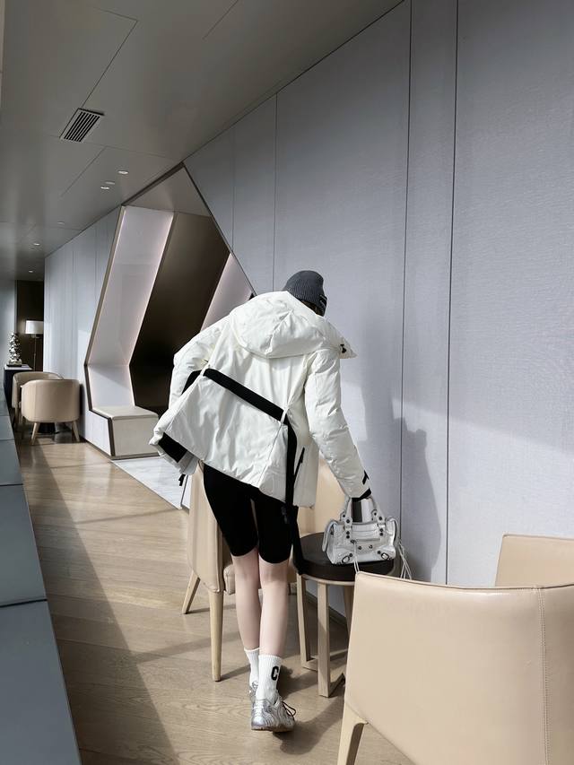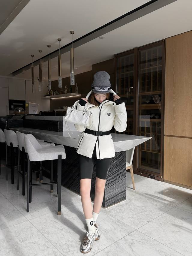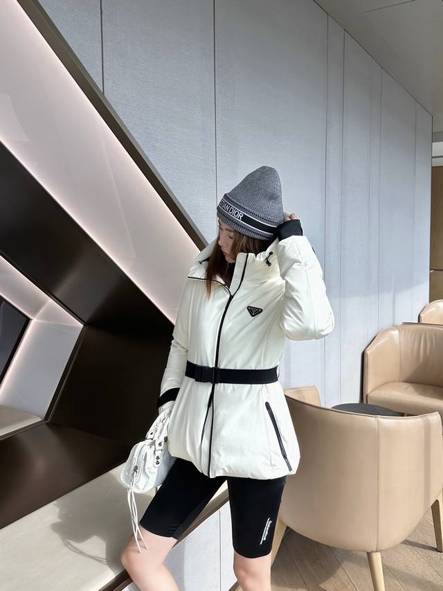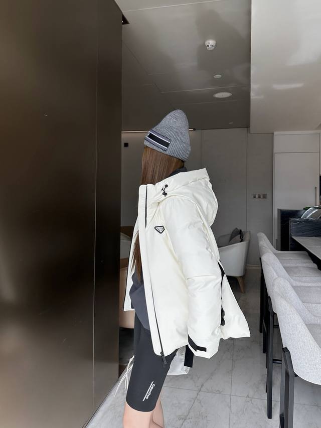 prad*A New winter ski suit series, filled with 90% white duck down for extra warmth! Classic inverted triangle logo, contrasting color stripe zipper, extended cuffs with finger loop design, slim fit, hooded down jacket/coat! White, Black, Size M: Shoulder width 47cm, Chest 108cm, Sleeve length 62cm, Length 67cm. DDD