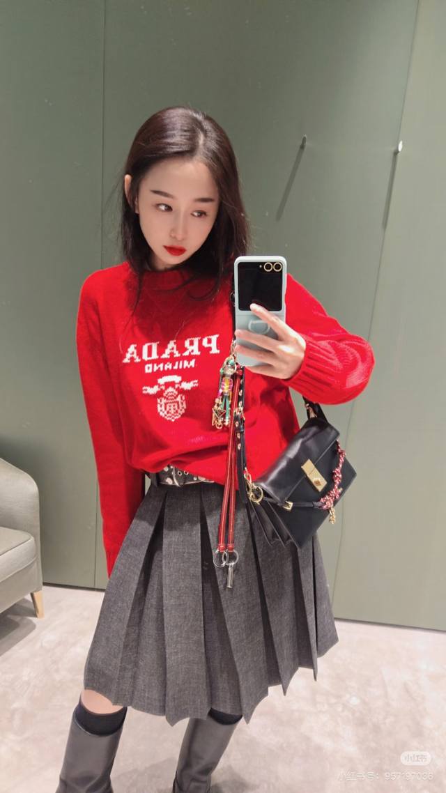 prad*New high-end custom 100% wool yarn fabric, precision embroidered logo, short pullover round neck long-sleeved knit top! Gray, Red, Size M: Bust 94cm, Sleeve Length 59cm, Length 49cm DDD