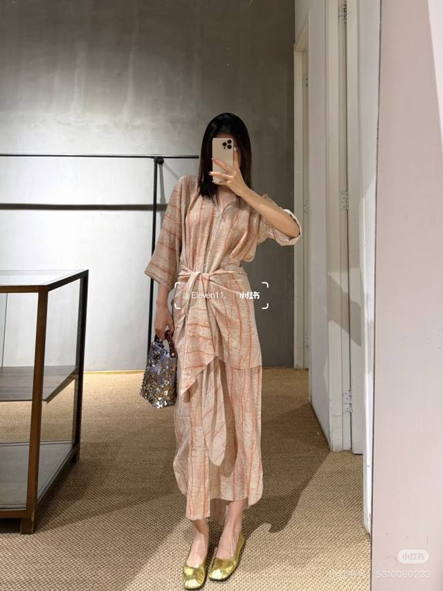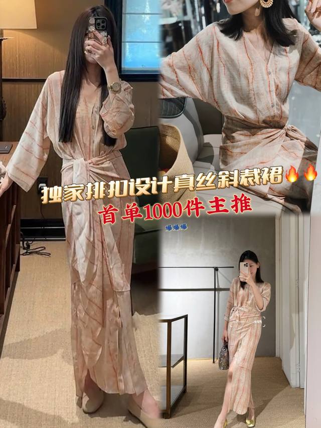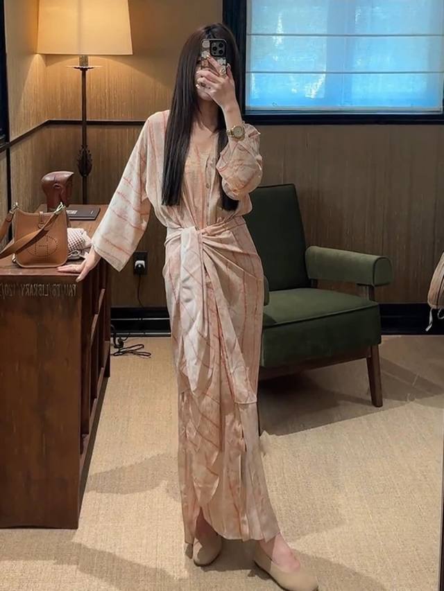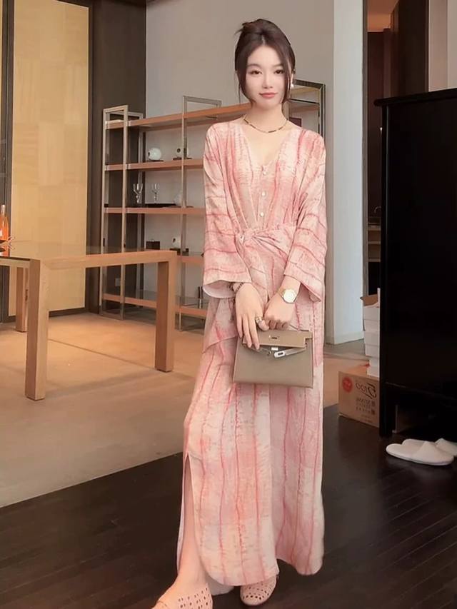 Premium Edition First Order: 1,000 pieces. Featured: Premium Cos Silk Light Pink Striped Maxi Dress. V-neck, buttoned design, unique and elegant. Waist-hugging design contours the figure. Slits add movement. Lightweight silk fabric offers a relaxed feel. A treasured item for a laid-back, premium look. Smlxl