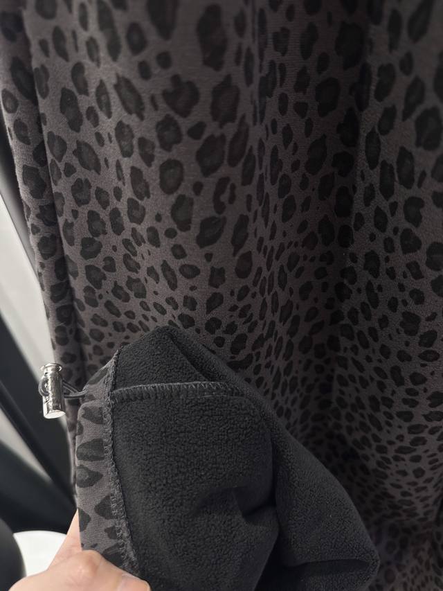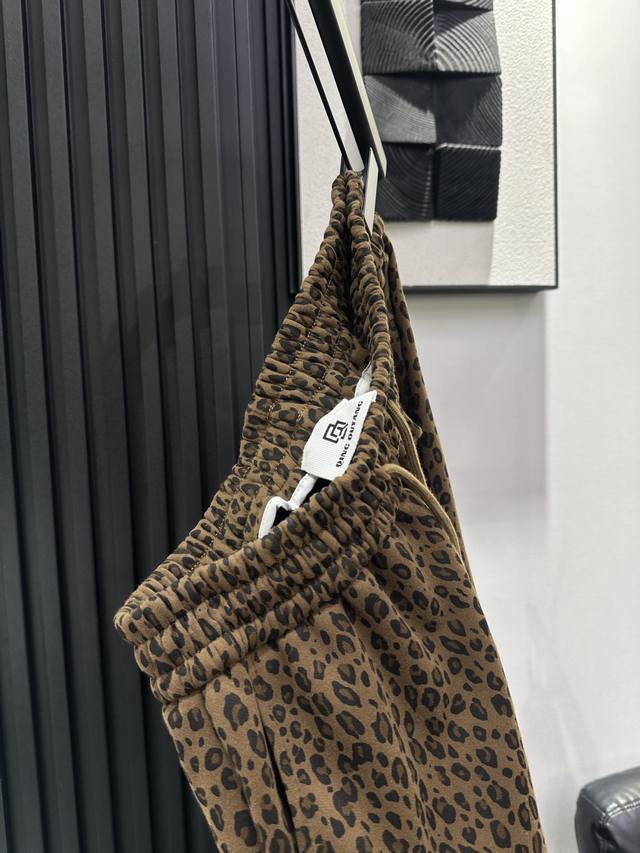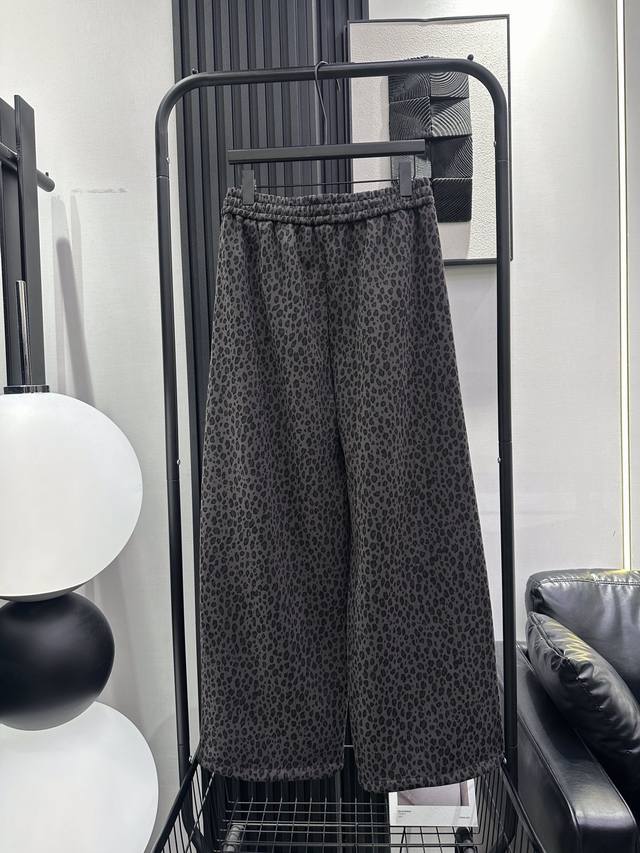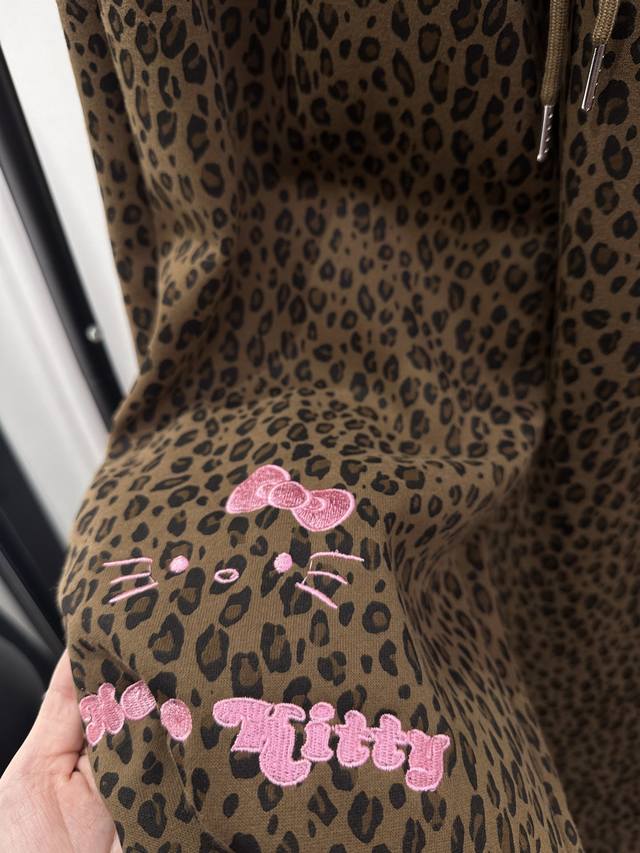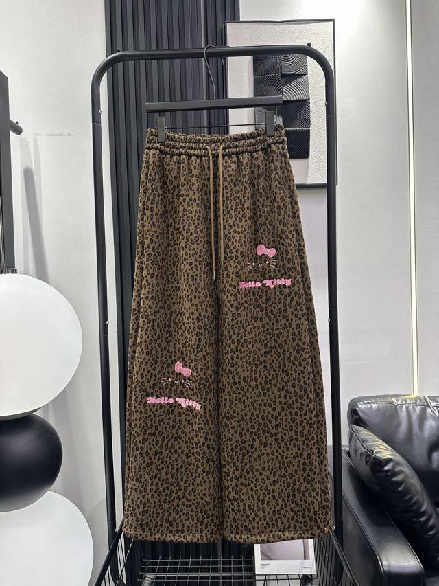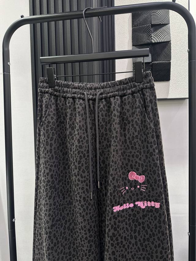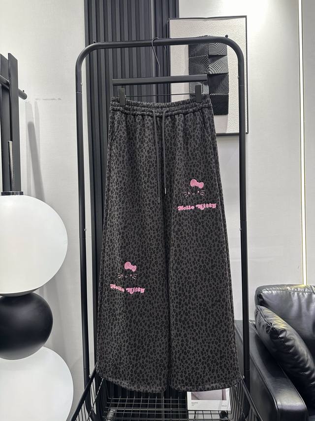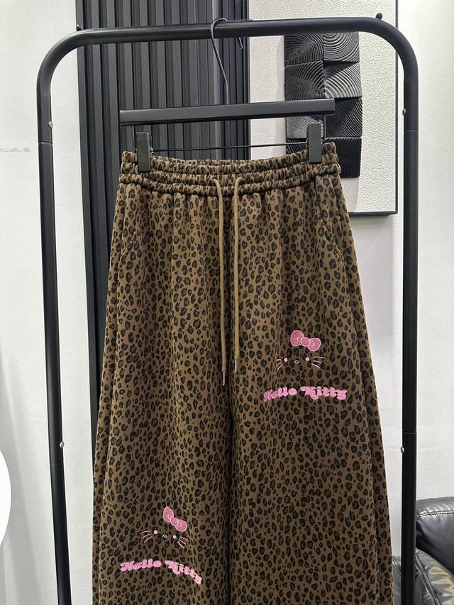 Qoy - New Korean Style Sweet and Cool Heavy-Duty KT Embroidered Leopard Print Fleece-Lined Wide-Leg Pants. Elastic waistband for maximum coverage. Drawstring cuffs for two-way wear. Super slimming and stylish design. Perfect for commuting and everyday wear. Available in S, M, L, XL.