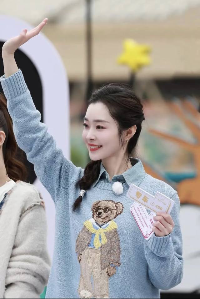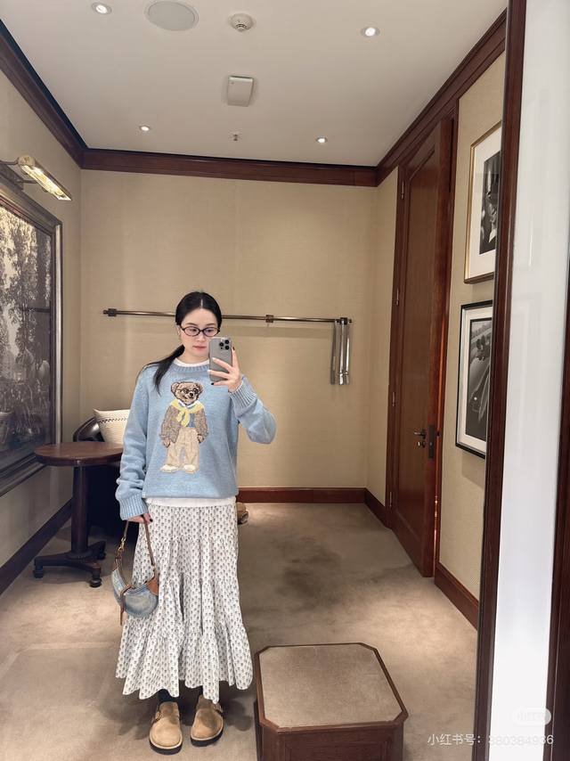 Ralph Laure* New high-end custom wool blend yarn fabric, yellow shawl, glasses, bear, Rl logo decorated round neck pullover long sleeve knit top! Blue, size M: shoulder width 37, bust 88, sleeve length 58, length 57.