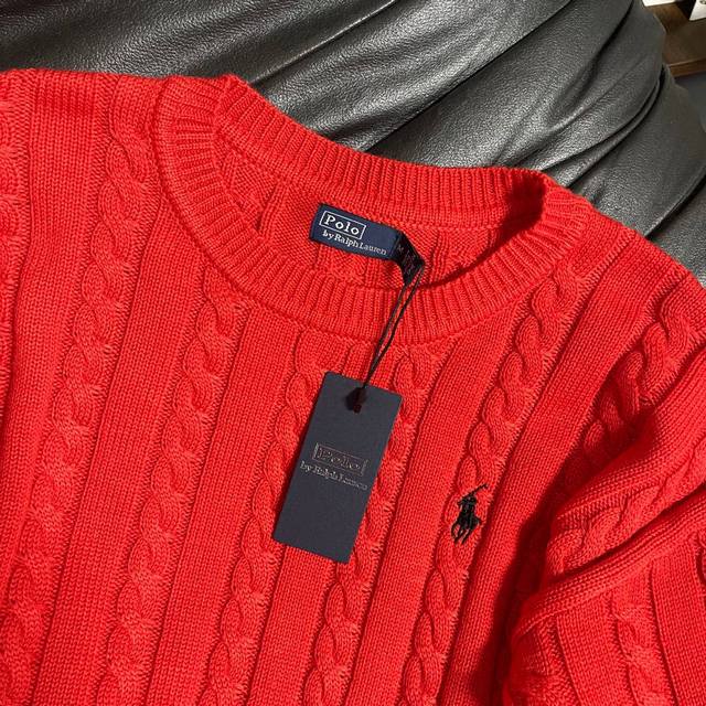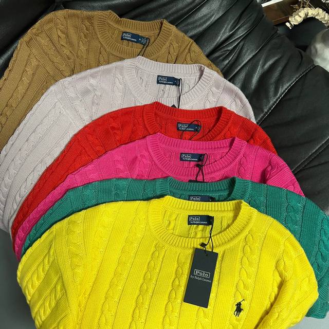 Ralph Lauren 2025 New Sweater DDD A bold autumn/winter color bomb! DDD Available in six colors: camel, pink, rose, green, and yellow. Features a cable knit texture, embroidered horse pattern, and a thick knit crew neck design. DDD Versatile style, available in 6 colors, sizes S, M, and L. DDD