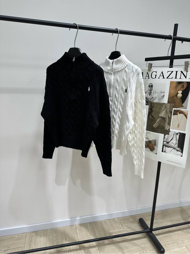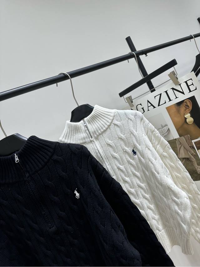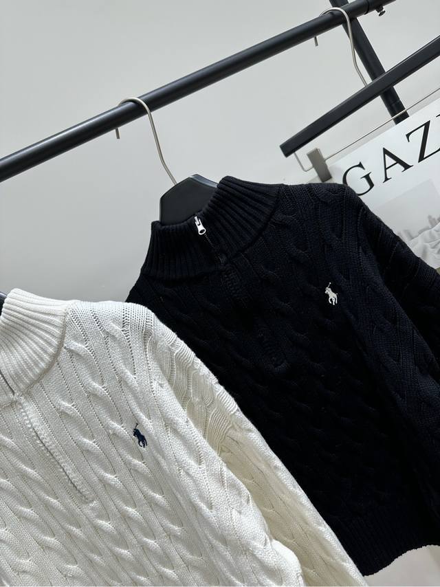 Ralph Lauren Half-Zip Cable Knit Stand Collar Sweater DDD, Fabric: 100% Cotton DDD Colors: White, Black DDD Ralph Lauren Half-Zip Cable Knit Sweater DDD Classic cable knit texture half-zip stand collar design DDD Retro and practical DDD Soft and warm 100% cotton material, super comfortable to wear in autumn and winter DDD The pony embroidery on the chest is very recognizable DDD It's okay to wear alone or layered, easy to handle for commuting and leisure~ DDD Flat lay size: DDD S: Shoulder width 56, Bust 110, Length 51, Sleeve length 50 DDD M: Shoulder width 57, Bust 114, Length 53, Sleeve length 51 DDD L: Shoulder width 58, Bust 118, Length 55, Sleeve length 52 DDD Manual measurement may have an error of 2-3cm, which is within the normal range DDD