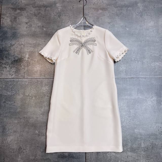 Hot-selling recommendation Valent0ڢ show 2025 early autumn new style, high version 1:1 heavy handmade custom series shiny rhinestone neckline pinched beaded bow design age-reducing artifact cute sexy charming classic three-dimensional tailoring very good body modification, loose slim short-sleeved dress
