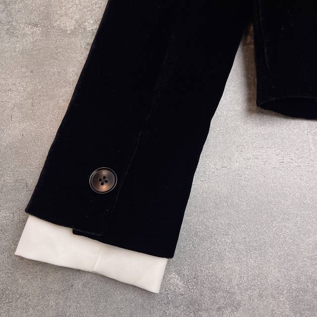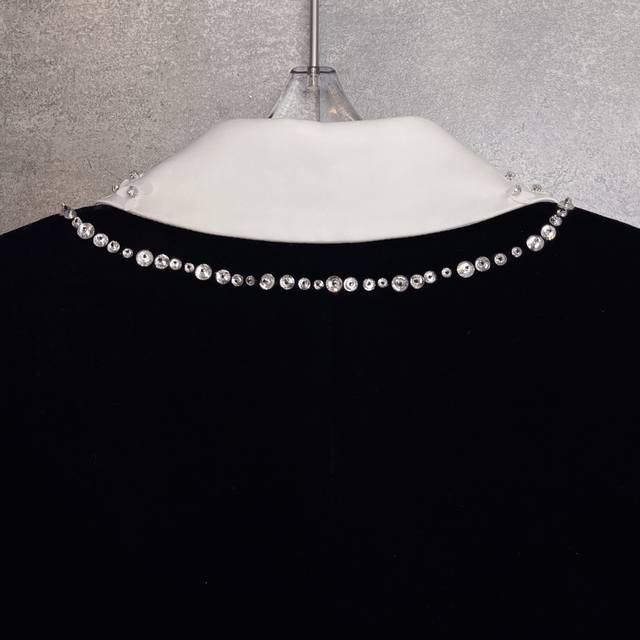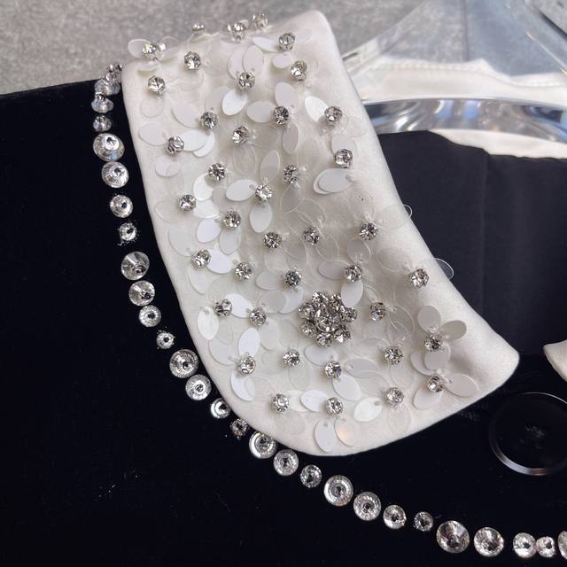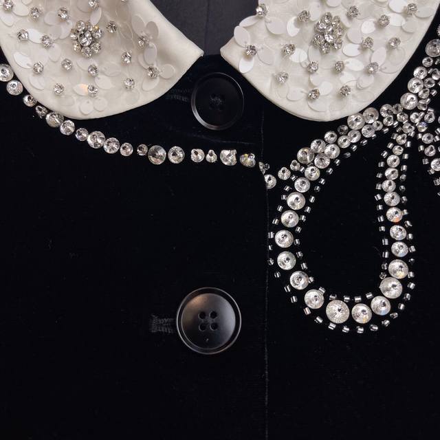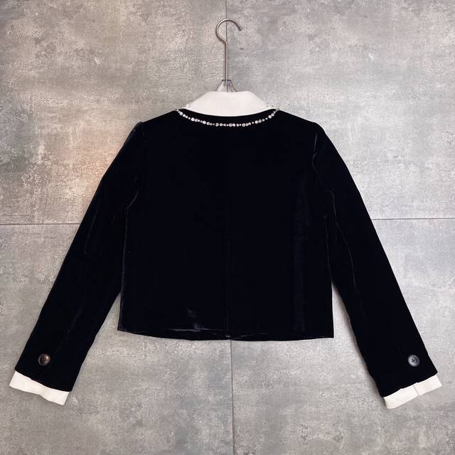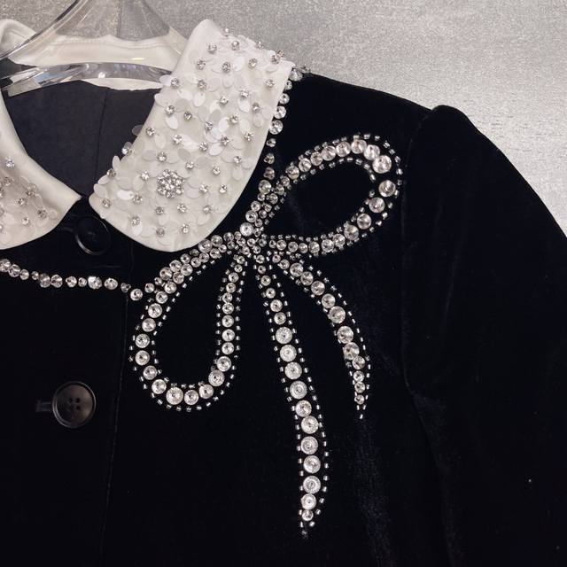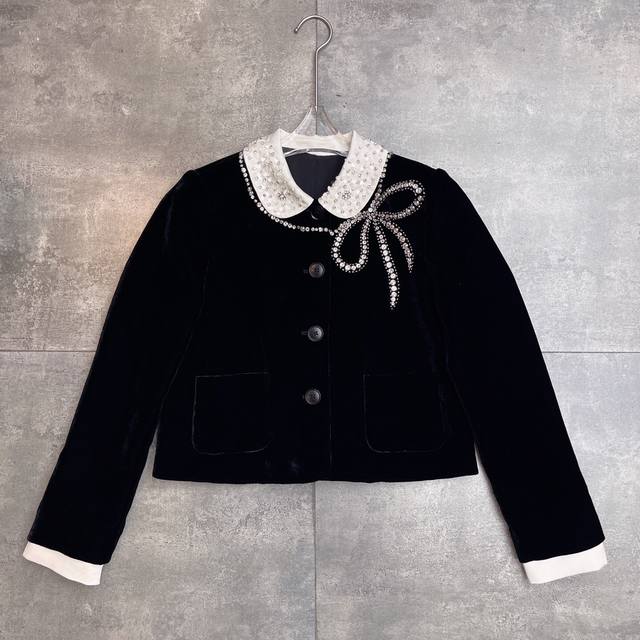 Hot-selling velvet jacket, celebrity style, M*Umiu 2025 Autumn/Winter boutique new arrival, a must-have versatile long-sleeved jacket with a preppy style lapel, handmade beaded bow, and rhinestone details. Fabric composition: 35% silk, 65% polyester fiber. Color: Black. Sizes: S, M, L, XL. Shoulder width: 37, 38, 39, 40. Bust: 92, 96, 100, 104. Waist: . Sleeve length: 60, 61, 62, 62. Length: 49, 50, 51, 52.