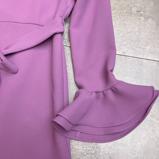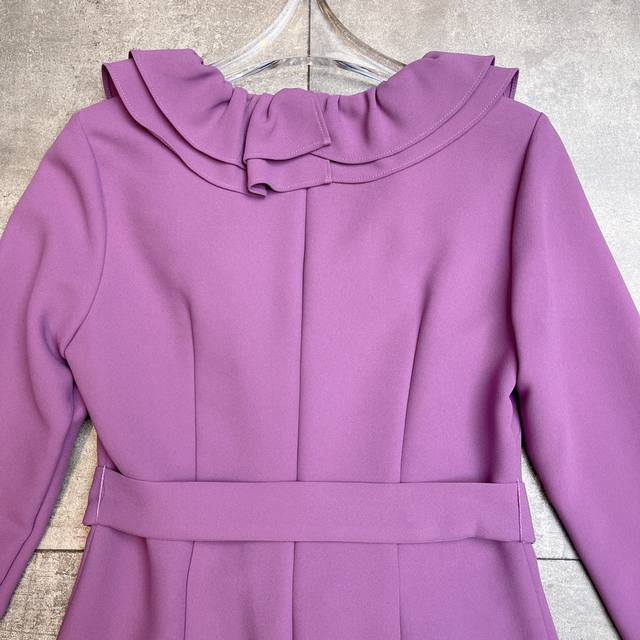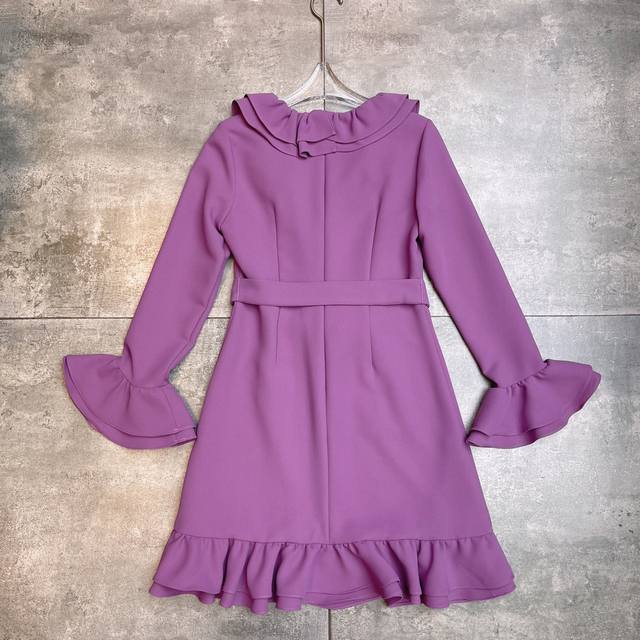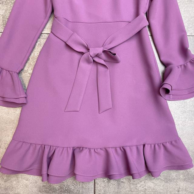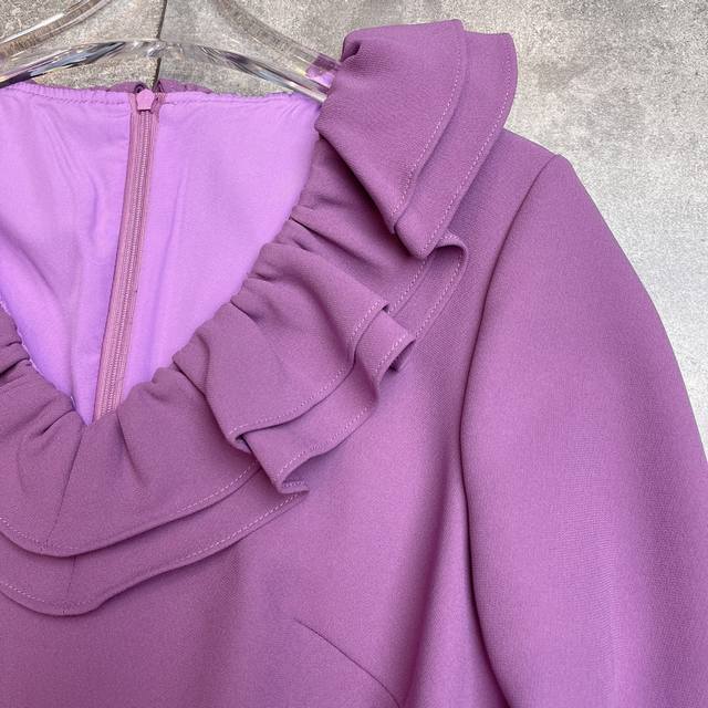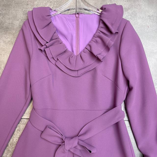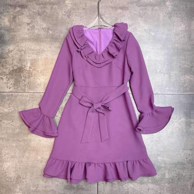Restocked item. Valent's 2025 Early Autumn collection, featuring a signature V-neck, ruffled, layered design that's both retro and romantic. Waist-cinching fishtail long-sleeved dress. Fabric composition: 31% silk, 69% viscose. Colors: Red, Purple, Black. Sizes: S, M, L, XL. Shoulder width: 37, 38, 39, 40. Bust: 86, 90, 94, 98. Waist: 72, 76, 80, 84. Sleeve length: 58, 59, 60, 61. Dress length: 88, 89, 90, 91.