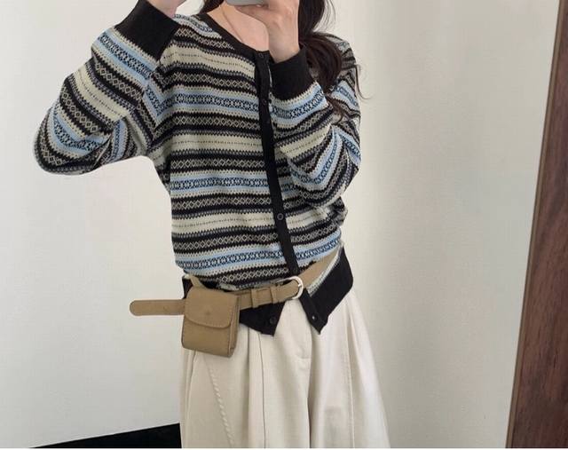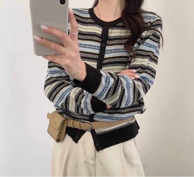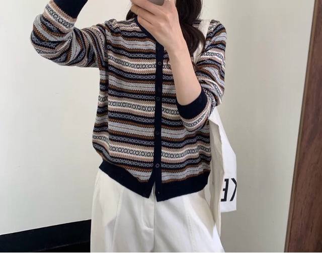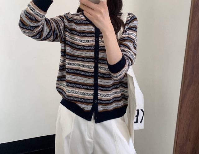 / Retro round neck striped 33 wool design knitted cardigan 2025 autumn new niche