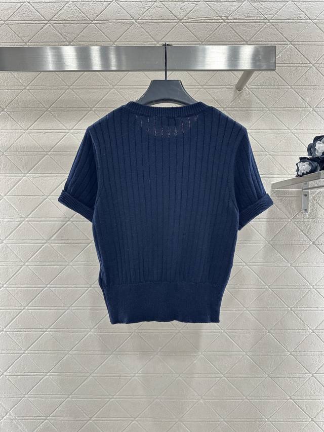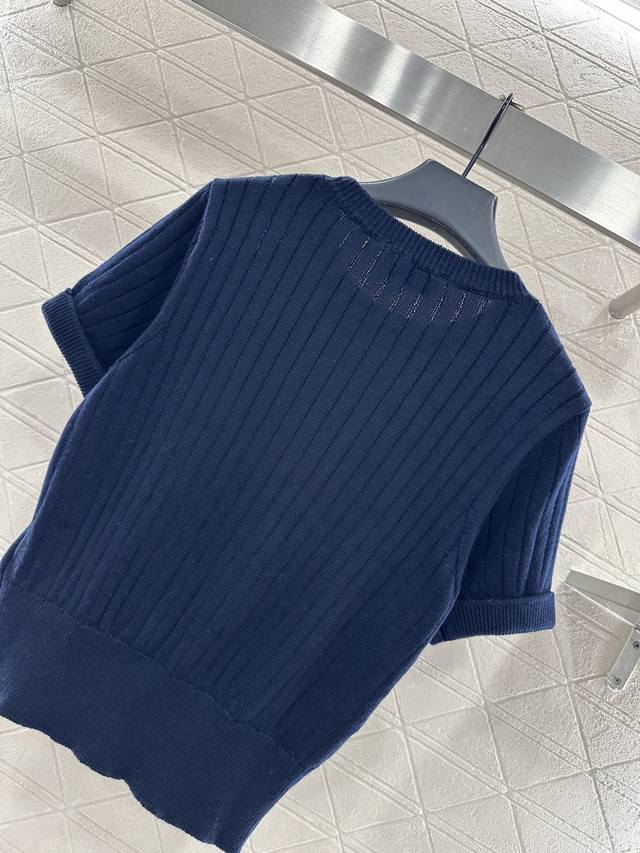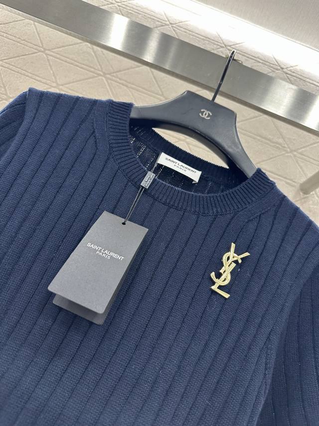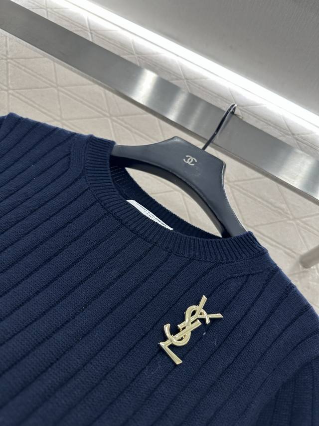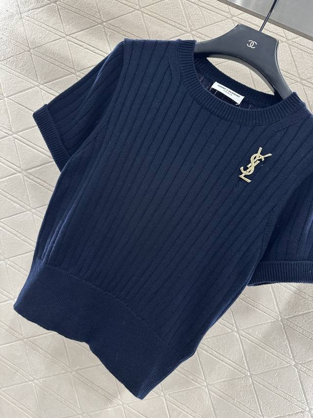 Saint Lauren*2026 New Arrival Ddd Vertical Ribbed Brooch Knit Short-Sleeve T-Shirt Ddd Custom Yb cotton yarn, high-quality texture, comfortable and soft, round neck knit short-sleeve cut, all-over solid color, versatile and timeless, large vertical ribbed texture with delicate texture, visually slimming, paired with ribbed edging, easily highlighting perfect details and texture, gold letter brooch on the chest, exquisite and stylish, versatile style. Custom fabric and accessories, look for high-quality navy blue. DDD