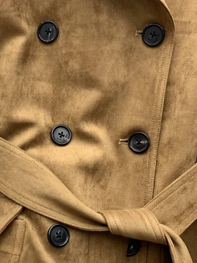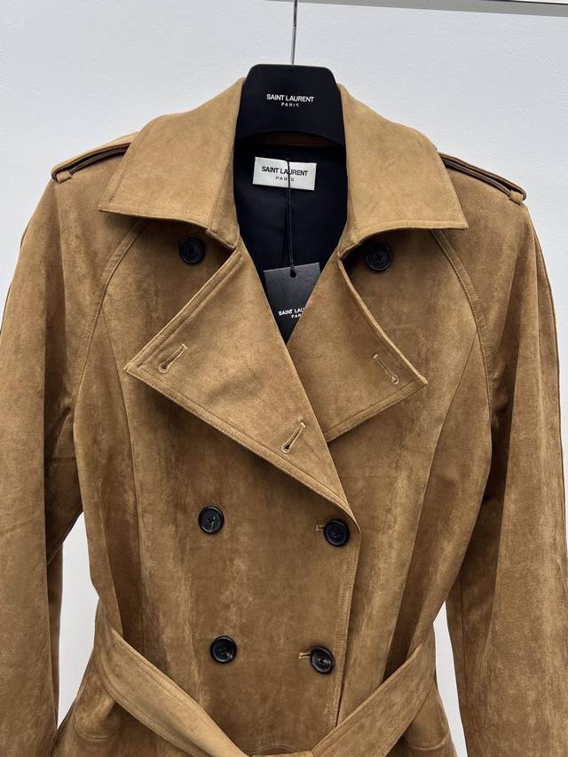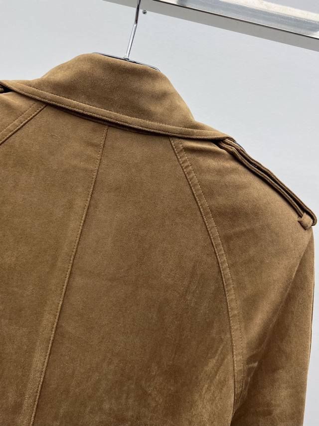 25Fw Double-breasted belted long trench coat. Features an eight-button closure, two flap pockets on the front, a two-way Ulster lapel, tie-up cuffs, and an adjustable and detachable belt. Buttoned epaulettes add a touch of sophistication. The technical suede has a soft and delicate texture, blending retro, rugged, and gentle aesthetics in a contradictory way. Pair it with long boots for a chic and modern look, a truly sophisticated and powerful style